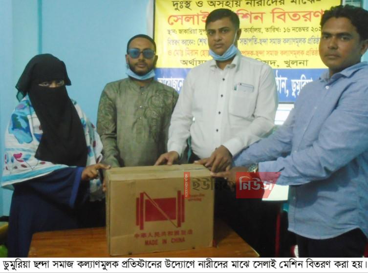 ডুমুরিয়া (খুলনা) প্রতিনিধি : ডুমুরিয়ায় মানবিক সংগঠন ছন্দা সমাজ কল্যাণমূলক প্রতিষ্ঠানের উদ্যোগে দুঃস্থ ও অসহায় নারীদের মাঝে সেলাই মেশিন বিতরণ করা হয়েছে। গতকাল সোমবার সকালে উপজেলার জাকারিয়া সুপার মার্কেটে নিজস্ব কার্যলয়ে সংস্থার সভাপতি ওমর ফারুকের সভাপতিত্বে বিতরণ করা হয়। এ সময় উপস্থিত ছিলেন প্রকৌশলী মাসুদ আজিজুর রহমান, ডুমুরিয়া ব্লার্ড ডোনার্স ক্লাবের সভাপতি মোস্তাফিজুর রহমান সাগর, সংস্থার সাধারণ সম্পাদক মিরান হোসেন প্রমুখ। এ সময় সভাপতি বলেন, ছন্দা সমাজ কল্যাণমুলক প্রতিষ্টানটি মানবিক ও মানবতার জন্য। আমরা সাধ্যমত গরীব ও অসহায় মানুষের সাহায্য করার চেষ্টা করি। এরই অংশ হিসেবে আজ ১৩জন দুঃস্থ নারীর মাঝে ১৩টি সেলাই মেশিন বিতরণ করা হল। এছাড়াও অসুস্থ্য রোগী, করোনা কালীন সময়ে খাবার সামগ্রী দেওয়া হয়।