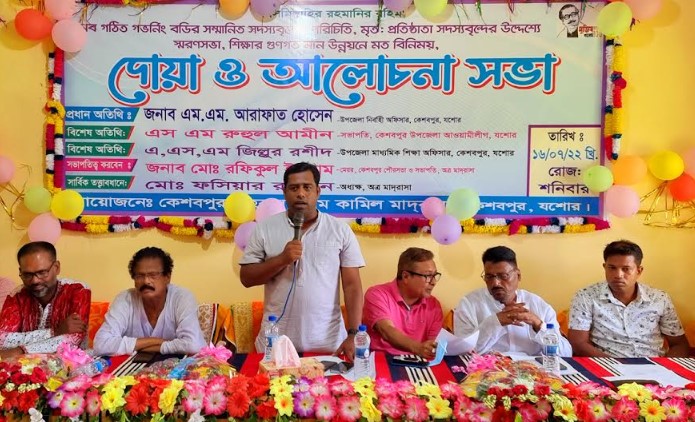 এস আর সাঈদ, কেশবপুর (যশোর) : যশোরের কেশবপুর বাহরুল উলুম কামিল মাদ্রাসার গভনিং বডির সদস্যবৃন্দের পরিচিতি সভা, মৃত প্রতিষ্ঠাতা সদস্যদের স্মরণ সভা, শিক্ষার গুনগত মান উন্নয়নে করণীয় বিষয়ক আলোচনা সভা ও দোয়া অনুষ্ঠান ১৬ জুলাই সকালে মাদ্রাসার সভাকক্ষে অনুষ্ঠিত হয়েছে। মাদ্রাসার সভাপতি পৌর মেয়র রফিকুল ইসলামের সভাপতিত্বে প্রধান অতিথির বক্তব্য রাখেন উপজেলা নির্বাহী অফিসার এম এম আরাফাত হোসেন। বিশেষ অতিথির বক্তব্য রাখেন উপজেলা আওয়ামী লীগের সভাপতি এস এম রুহুল আমিন ও উপজেলা মাধ্যমিক শিক্ষা অফিসার এ এস এম জিল্লুর রশীদ। অনুষ্ঠানে স্বাগত বক্তব্য রাখেন মাদ্রাসার অধ্যক্ষ ফসিয়ার রহমান।