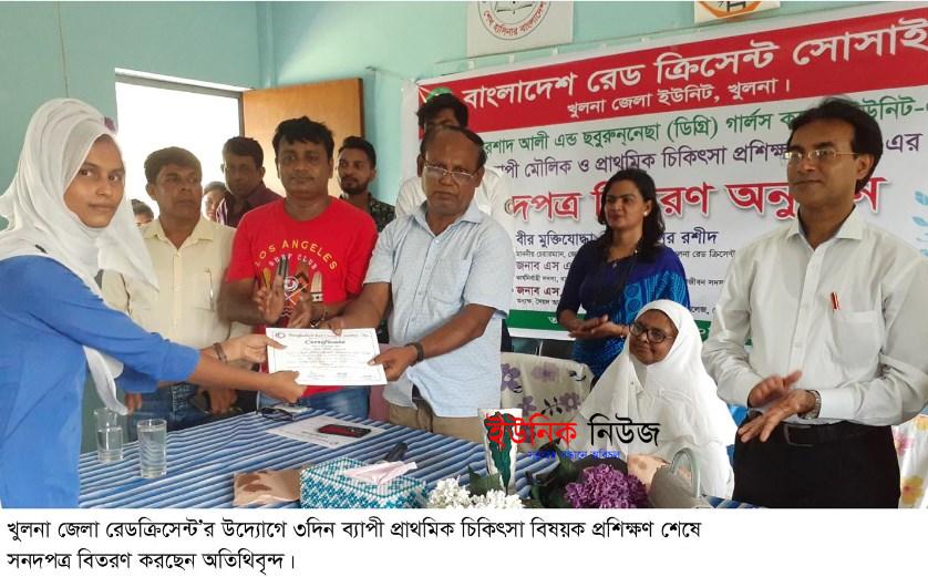 বিজ্ঞপ্তি: বাংলাদেশ রেডক্রিসেন্ট সোসাইটি খুলনা জেলা ইউনিটের উদ্যোগে ৩ দিন ব্যাপী মৌলিক ও প্রাথমিক চিকিৎসা বিষয়ক প্রশিক্ষণ শেষে শিক্ষার্থীদের মাঝে সনদপত্র বিতরণ করা হয়েছে। রূপসা উপজেলার সৈয়দ আরশাদ আলী এন্ড সবুরুন্নেছা (ডিগ্রি) গালার্স কলেজে অনুষ্ঠানে সভাপতিত্ব করেন অধ্যক্ষ এস,এম আমজাদ হোসেন। প্রধান অতিথি ছিলেন খুলনা জেলা পরিষদের সদস্য শেখ আবু জাফর। বিশেষ অতিথি ছিলেন বাংলাদেশ ফেডারেল সাংবাদিক ইউনিয়নের নির্বাহী সদস্য এসএম ফরিদ রানা, রেডক্রিসেন্ট সোসাইটি খুলনা জেলা ইউনিটের লেভেল অফিসার মঈনুল ইসলাম পলাশ, কলেজ পরিচালনা পরিষদের সদস্য হোসনেয়ারা বেগম ও যুব রেডক্রিসেন্ট সোসাইটি খুলনা জেলা ইউনিটের যুব-প্রাধান মাহমুদুল ইসলাম সনেট। বক্তব্য রাখেন ও উপস্থিত ছিলেন সহযোগী অধ্যাপক সুরাইয়া দীপা, মঈনুল ইসলাম আল-ফারুক, সঞ্জয় সরকার, প্রশিক্ষক ছিলেন বিডিআরসির জাতীয় প্রশিক্ষক মোঃ তৌফিকুল ইসলাম, জেলা যুব রেডক্রিসেন্ট সোসাইটির উপ-যুবপ্রধান-১ শেখ আল আমিন, উপ-যুবপ্রধান-২ আল-আমিন তারেক, প্রশিক্ষণ বিভাগীয় প্রধান আব্দুল্লাহ আল মামুন, জনসংখ্যা ও পরিকল্পনা বিভাগীয় প্রধান জুবায়ের হাসান সৈকত। এছাড়া উপস্থিত ছিলেন যুব রেডক্রিসেন্ট সোসাইটি খুলনা জেলা ইউনিটের সদস্য লুবাইনা সুলতানা, বায়জিদ ফয়সাল, রুমানা ইয়াসমিন মৌ এবং কলেজের শিক্ষক মন্ডলী। প্রশিক্ষণে ৪৬ জন শিক্ষার্থী অংশ গ্রহণ করেন। প্রশিক্ষণে প্রাথমিক চিকিৎসায় শক, মূর্ছা, ফিট, অজ্ঞান, কৃত্রিম শ্বাস-প্রশ্বাস, রক্তপাত ও রক্তপাত বন্ধের উপায়, পোড়া ও বৈদ্যুতিক আঘাত, হাড় ভাঙ্গা ও অনড়করন এবং ক্ষত ও ক্ষতের পরিচর্যা বিষয়ের ধারনা দেওয়া হয়।