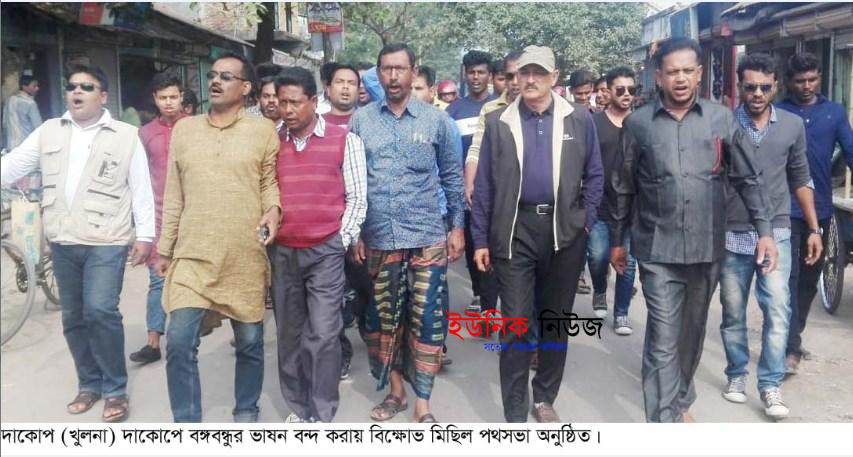 দাকোপ ,খুলনা : খুলনার দাকোপে উপজেলা পরিষদের জনপ্রিয় চেয়ারম্যান মুনসুর আলী খান সম্পর্কে একটি কুচক্রীমহল অপপ্রচার, বিজয় দিবসের দিন বঙ্গবন্ধুর ভাষন বন্ধ ও সরকারী কর্মচারীকে লাঞ্চিত করার প্রতিবাদে বিক্ষোভ মিছিল পথসভা অনুষ্ঠিত হয়েছে।