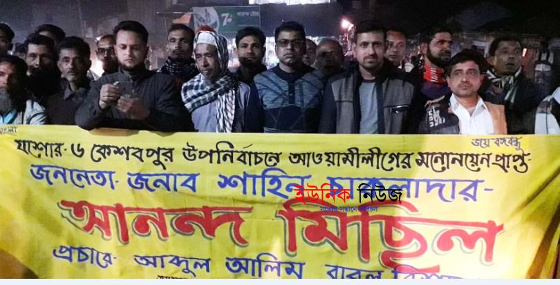 রাজীব চৌধুরী, কেশবপুরঃ যশোর-০৬ কেশবপুর আসনের উপ-নির্বাচনে জননেতা জনাব শাহীন চাকলাদার আওয়ামীলীগের মনোনয়ন পাওয়ায় কেশবপুর উপজেলার ত্রিমোহিনী ইউনিয়ন আওয়ামীগের আহবায়ক আব্দুল আলিম বাবুল বিশ্বাসের নেতৃত্বে সোমবার ত্রিমোহিনী বাজারে আনন্দ মিছিল বের হয় । মিছিলটি ত্রিমোহিনী বাজার সোনালী ব্যাংকের সামনে থেকে শুরু হয়ে বাজারের বিভিন্ন স্থান প্রদক্ষিণ করে । মিছিলে উপস্থিত ছিলেন ০১ নং ত্রিমোহিনী ইউনিয়ন আওয়ামীলীগের আহবায়ক আব্দুল আলিম বাবুল বিশ্বাস । এছাড়া আরোও উপস্থিত ছিলেন মোঃ আব্দুর রশিদ সানা, মাস্টার আব্দুর রাজ্জাক,আব্দুল আজিজ মোড়ল, মাস্টার মোশাররফ হোসেন, নজরুল ইসলাম ,মঞ্জুর রহমান, হাসান বায়জিদ, সরদার মাহাবুর রহমান, হারুন, বাবুল মোড়ল, ইমরান, রুবেল মোড়ল, জনি, সুজন, সালাউদ্দীন, আনিছুর সহ প্রমুখ ।