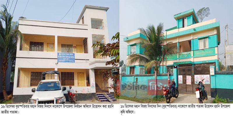 গত ১৬ ডিসেম্বর বৃহস্পতিবার সারাদেশের ন্যায় দাকোপে উপজেলা প্রশাসনের আয়োজনে মহান বিজয় দিবস পালনে দিনব্যাপী নানা কর্মসূচীর মধ্যে অন্যতম ছিল সকল সরকারী বেসরকারী ভবনে জাতীয পতাকা উত্তোলন। কিন্তু উপজেলা পরিষদ চত্বরে থাকা উপজেলা কৃষি অফিস ও উপজেলা নির্বাচন অফিসে দিনভর জাতীয় পতাকা উত্তোলন করা হয়নি। উপজেলা পরিষদ মাঠে বিজয় দিবসের অনুষ্ঠান চলাকালীন স্থানীয় এক সাংবাদিক বিষয়টি দেখে তার ফেইজবুকে পেইজে দু’টি ভবনে জাতীয় পতাকা না উঠানোর ছবিসহ বিষয়টি তুলে ধরলে উপজেলা বাসীর মাঝে তীব্র প্রতিক্রিয়া সৃষ্টি হয়। এ ঘটনায় কৃষি সম্প্রসারন কর্মকর্তা মোঃ মোস্তাফিজুর রহমান মোবাইলে ওই সাংবাদিককে ১০ মিনিটের মধ্যে পোষ্টটি সরিয়ে ফেলার কথা বলেন। পোষ্টটি না সরানো হলে তার বিরুদ্ধে ব্যবস্থা নেওয়ার হুমকি দেন। মহান বিজয় দিবসের গৌরব গাথা এই দিনে সরকারী কর্মকর্তাদের এমন ঔদ্বাত্যপূর্ন আচারনের তীব্র নিন্দা ও প্রতিবাদ জানিয়ে দাকোপ উপজেলা মুক্তিযোদ্ধা সংসদের ডেপুটি কমান্ডার মোহিত লাল রায় বলেন, সংশ্লিষ্টদের বিরুদ্ধে ব্যবস্থা নেওয়ার দাবী জানাই। দাকোপ উপজেলা ভাইস চেয়ারম্যান গৌরপদ বাছাড় এটাকে সরকারের বিরুদ্ধাচারন দাবী করে সঠিক তদন্ত পূর্বক ব্যবস্থা গ্রহনের দাবী জানিয়েছেন। অভিযোগে বিষয়ে জানতে চাইলে উপজেলা কৃষি অফিসার মেহেদী হাসান খান মোবাইলে তিনি পাল্টা প্রশ্ন করে বলেন, কৃষি অফিসে কি পতাকা উত্তোলন হওয়ার কথা, কৃষি অফিস সরকারী ১৭টি হস্তান্তরিত অফিসের একটি। এ ছাড়া উপজেলা নির্বাচন কর্মকর্তা কাজী মাহমুদ হোসেন বলেন, এবারের মত বিষয়টি আসলে আমাদের ভূল হয়েছে ভবিষাতে এ ধরনের ভূল আর হবেনা। সরকারী দপ্তরে পতাকা উত্তোলন না করার বিষয়ে জানতে চাইলে উপজেলা নির্বাহী অফিসার মিন্টু বিশ্বাস ঘটনার সত্যতা স্বীকার করে বলেন, উপজেলা প্রশাসনের পক্ষ থেকে আমরা প্রস্তুতি মূলক সভায় সকল কর্মকর্তাদের যথাযথ মর্যাদায় দিবসটি পালনের নির্দেশনা দিয়েছিলাম। এ ব্যাপারে সাবেক উপজেলা চেয়ারম্যান ও উপজেলা আওয়ামীলীগের সভাপতি আলহাজ্ব শেখ আবুল হোসেন যারা এহেন ঘৃনিত কাজের সাথে জড়িত তাদের দৃষ্টান্ত মূলক শাস্থির দাবী জানান।
