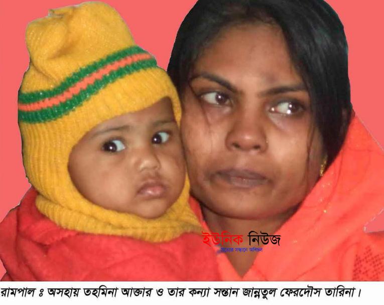 আবু হোসাইন সুমন, মোংলা : প্রতারণার আশ্রয় নিয়ে বিয়ে ও সংসার করার দীর্ঘদিন ৩ বছর প্রথম স্ত্রী তহমিনা এবং কন্যা তারিনাকে ফেলে এসে দ্বিতীয় বিবাহ করা স্বামীর বাড়ীতে উঠে স্বামী-সন্তানের স্বীকৃতির আদায়ের জন্য অনশন করছেন তহমিনা। স্বামী ও সন্তানের পিতৃ অধিকারের দাবীতে ফেনীর সোনাগাজী উপজেলার বগাদানা গ্রাম থেকে গত শনিবার আসা তহমিনা আক্তার (২৭) তাদের ১ বছরের কন্যা সন্তান জান্নাতুল ফেরদৌস তারিনকে নিয়ে বাগেরহাটের রামপাল উপজেলার গিলাতলা গ্রামের স্বামী রাখাল চন্দ্র পাল ওরফে রিপন খানের বাড়ীতে উঠে গত ৬ দিন ধরে অবস্থান করছেন।