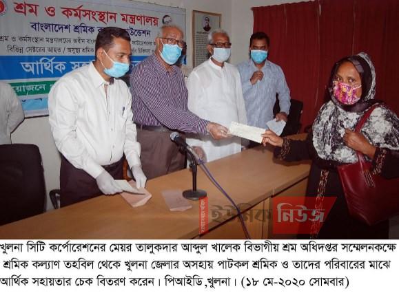 খুলনা অফিস : শ্রম ও কর্মসংস্থান মন্ত্রণালয়ের অধীন বাংলাদেশ শ্রমিক কল্যাণ ফাউন্ডেশনের উদ্যোগে আজ (সোমবার) সকালে খুলনা বিভাগীয় শ্রম অধিদপ্তর সম্মেলনকক্ষে শ্রমিক কল্যাণ তহবিল থেকে খুলনা জেলার ৩৭ জন অসহায় পাটকল শ্রমিক ও তাদের পরিবারের মাঝে ১৬ লাখ ৬৫ হাজার টাকার আর্থিক সহায়তার চেক বিতরণ করা হয়। খুলনা সিটি কর্পোরেশনের মেয়র তালুকদার আব্দুল খালেক এসব চেক অসহায় পাটকল শ্রমিক ও তাদের পরিবারের হাতে তুলে দেন।