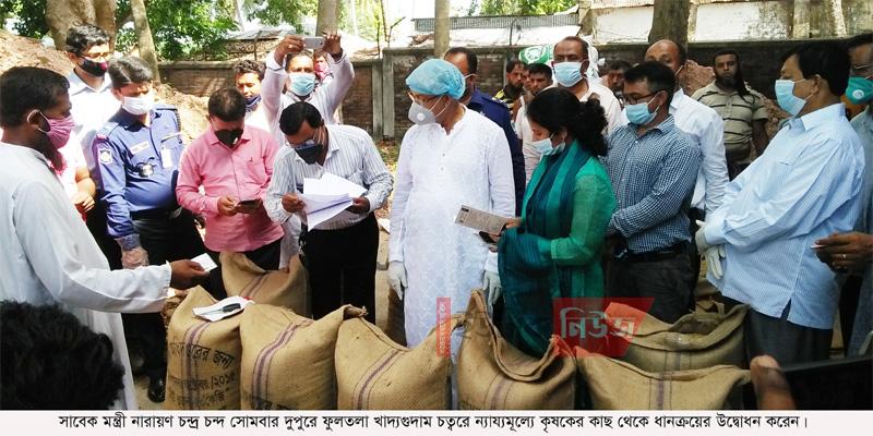 ফুলতলা (খুলনা) প্রতিনিধিঃ কৃষকের হাসি মোবাইল অ্যাপস এর মাধ্যমে সরাসরি কৃষকের নিকট থেকে ন্যায্যমূল্যে বোরোধান ক্রয় উপজেলা প্রশাসন আয়োজিত সোমবার দুপুরে ফুলতলা খাদ্য গুদাম চত্বরে উদ্বোধন করা হয়। ইউএনও পারভীন সুলতানার সভাপতিত্বে অনুষ্ঠানে প্রধান অতিথি ছিলেন সাবেক মন্ত্রী নারায়ণ চন্দ্র চন্দ এমপি। বিশেষ অতিথি ছিলেন খুলনার পুলিশ সুপার এস এম শফিউল্লাহ, খুলনার অতিরিক্ত জেলা ম্যাজিষ্ট্রেট মোঃ ইউসুফ আলী, উপজেলা পরিষদের চেয়ারম্যান আলহাজ্ব শেখআকরাম হোসেন, অতিরিক্ত পুলিশ সুপার মোঃ সজীব খান। অন্যান্যের মধ্যে উপস্থিত ছিলেন খাদ্য কর্মকর্তা মোঃ আনোয়ার হোসেন, ভারপ্রাপ্ত গুদাম কর্মকর্তা মোঃ রবিউল ইসলাম, ওসি মোঃ মনিরুল ইসলাম, ইউপি চেয়ারম্যান শরীফ মোহাম্মদ ভুইয়া শিপলু, আওয়ামীলীগ নেতা মোঃ আসলাম খান, মৃনাল হাজরা, আবু তাহের রিপন, উপজেলা প্রেসক্লাব সভাপতি শামসুল আলম খোকন, প্রেসক্লাব সভাপতি তাপস কুমার বিশ্বাস, সাংবাদিক শেখ মনিরুজ্জামান, সহকারী অধ্যাপক মোঃ নেছার উদ্দিন, কৃষক প্রতিনিধি মোঃ রবিউল ইসলাম, মনিরুল সিকদার প্রমুখ। লটারীর মাধ্যমে উপজেলার ৬৮৫ কৃষকের নাম তালিকাভুক্ত হয়। ২৬ টাকা কেজি দরে কৃষকপ্রতি ১ টন ধান বিক্রয় করতে পারবেন।