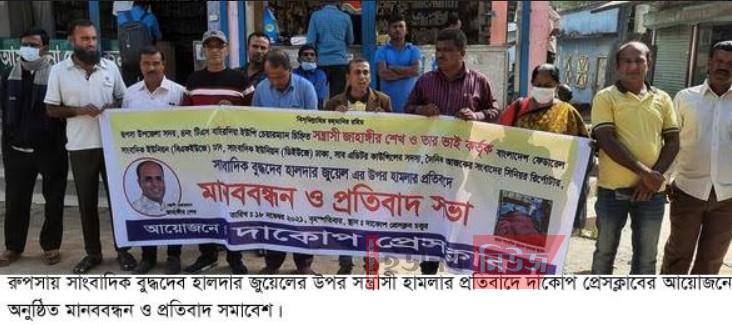 বৃহস্পতিবার বেলা ১১টায় দাকোপ প্রেসক্লাবের সামনে প্রেসক্লাবের সহ-সভাপতি কুমারেশ বিশ^¦াসের সভাপতিত্বে ও সাধারণ সম্পাদক মোজাফ্ফার হোসেনের পরিচালনায় অনুষ্ঠিত মানববন্ধন প্রতিবাদ সভায় বক্তৃতা করেন দাকোপ প্রেসক্লাবের সাবেক সভাপতি শচীন্দ্রনাথ মন্ডল, সাবেক সাধারণ সম্পাদক আজগর হোসেন ছাব্বির, জি.এম রেজা, সাবেক আহবায়ক গোবিন্দ বিশ^াস, বিধান চন্দ্র ঘোষ, গাজী আবুল বাশার, জাহিদুর রহমান সোহাগ, পারুল বেগম, মামুনুর রশিদ, মজনু ফকির, গোলাম রসুল সানি, ফারুক গাজী, নূর মোহাম্মদ, মনির হোসেনসহ আরো অনেকে। মানববন্ধনে বক্তারা প্রতিহিংসা পরায়ন হয়ে সাংবাদিক জুয়েলের উপর হামলার ঘটনায় নিয়মিত মামলা গ্রহনসহ ঘটনায় জড়িত সকল সন্ত্রাসীদের আইনের আওতায় এনে দৃষ্টান্ত মূলক শাস্তির জোর দাবি জানান।