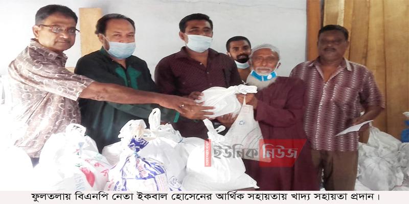 ফুলতলা (খুলনা) প্রতিনিধিঃ উপজেলা পরিষদের সাবেক ভাইস চেয়ারম্যান ও খুলনা মহানগর বিএনপির সহ-সভাপতি শেখ ইকবাল হোসেনের আর্থিক সহায়তায় মঙ্গলবার বেলা ১১টায় করোনা ভাইরাসের কারণে কর্মহীন, অসহায় দরিদ্র বিএনপি পরিবারের মাঝে খাদ্য সামগ্রী বিতরণ করেন। এ সময় অন্যান্যের মধ্যে উপস্থিত ছিলেন খুলনা জেলা বিএনপির সহ-সভাপতি এস এ রহমান বাবুল, বিএনপি নেতা ওয়াহিদুজ্জামান মোল্যা নান্না, দামোদর ইউনিয়ন বিএনপির সাবেক সভাপতি জামাল হোসেন ভুইয়া, মশিউর রহমান বিপ্লব, আফতাব উদ্দিন খান বিদ্যুৎ, আখতারুজ্জামান কচি, আবুল হোসেন, শেখ নজরুল ইসলাম, ছাত্রদলনেতা আসাদুজ্জামান জুয়েল, আবিদ হোসেন, হাফিজুর রহমান প্রমুখ।