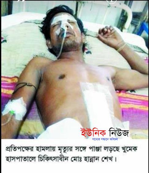 খুমেক হাসপাতালে সার্জারি বিভাগে ইউনিট-১ এর ৯-১০ ওয়ার্ডে ভর্তি মোঃ হান্নান শেখ চিকিৎসাধীন রয়েছেন। তিনি এখন মৃত্যুর সাথে পাঞ্জা লড়ছেন। গুরুত্বর আহতের চাচাতো ভাই মোঃ জামাল শেখ মঙ্গলবার এ প্রতিবেদককে জানান, গত ১৭ মার্চ গোপালগঞ্জে কাশিয়ানি থানাধীন ১০৯নং নিজামকান্দি সরকারি প্রাথমিক বিদ্যালয়ে বঙ্গবন্ধু জন্ম বার্ষিকী উপলক্ষে কেক কাটার আয়োজন ছিলো। ওই দিন দুপুর সাড়ে ১২টার দিকে কেক কাটাকে কেন্দ্র করে প্রতিপক্ষরা তার চাচাতো ভাই মোঃ হান্নান শেখকে ধারালো অস্ত্র দিয়ে পেছন থেকে আঘাত করে। এতে সে গুরুত্বর জখম হয়। এতে তার পেছন থেকে উরু থেকে পেটের মধ্যে গিয়ে নাড়িতে আঘাত লাগে। ওই দিন প্রথমে তাকে কাশিয়ানী স্বাস্থ্য কমপ্লেক্সে নিয়ে যাওয়া হয়। পরবর্তীতে গোপালগঞ্জ সদর হাসপাতালে ভর্তি করা হয়। তার পরের দিন হান্নানের অবস্থা খারাপ হলে তাকে উন্নত চিকিৎসার জন্য খুলনা মেডিকেল কলেজ হাসপাতালে প্রেরন করা হয়। এ পর্যন্ত তার তিন বার অস্ত্রপাচার করা হয়েছে। তাকে আইসিসিইতে রাখা হয়েছিল।
