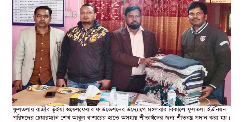 ফুলতলা (খুলনা) প্রতিনিধি// রাজীব ভুঁইয়া ওয়েলফেয়ার ফাউন্ডেশনের উদ্যোগে অসহায় শীতার্থ মানুষের জন্য ফুলতলা ও জামিরা ইউনিয়ন পরিষদের মাধ্যমে শীতবস্ত্র প্রদান করা হয়। ফাউন্ডেশনের চেয়ারম্যান মোহাম্মদ জহির উদ্দিন ভুঁইয়া রাজীবের পক্ষে সাধারণ সম্পাদক অনুপম মিত্র, রমজান আলী মিন্টু. সোহেল ভুঁইয়া, খায়রুজ্জামান সবুজ, মাসুদুল হক মিটু, ফুলতলা ইউপি চেয়ারম্যান শেখ আবুল বাশার, জামিরা ইউপি চেয়ারম্যান মোঃ মনিরুল ইসলাম সরদার, সচিব তানভীন আক্তার ডলি, ইউপি সদস্য ফারুক হোসে মোল্যা, শেখ মনিরুল ইসলাম, খলিলুর রহমান, মহিউদ্দিন শেখ, আব্দুল হালিম শেখ, ওলিয়ার রহমান বিশ্বাস, কুদ্দুস শেখ, মানুষের কল্যানে আমরা সংগঠনের ইকরামুল হোসেন তপু, শফিকুল ইসলাম ও আরিফুল ইসলাম প্রমুখ উপস্থিত ছিলেন। দুই ইউনিয়নে সকল ওয়ার্ডের জন্য ৬৫৫ এবং স্বেচ্ছাসেবী সংগঠন মানুষের কল্যানে আমরা এর জন্য ৩০টি শীতবস্ত্র প্রদান করা হয়।