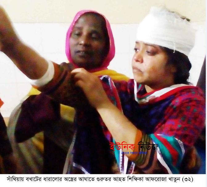 জানা যায়, সাঁথিয়া পৌরসভাধীন দৌলতপুর গ্রামের আঃ রহমানের কণ্যা এক সন্তানের জননী আফরোজা খাতুন ছেচানিয়া মেমোরিয়াল দাখিল মাদ্রাসার শিক্ষকতা করেন। প্রতিদিনের ন্যায় বুধবার সে মাদরাসা ছুটি শেষে অটো ভ্যান যোগে বাড়ি ফেরার পথে সাঁথিয়াÑবেড়া সড়কের ছেচানিয়া ব্রীজের উপর পৌছালে পূর্ব পরিকল্পিতভাবে এলাকার বখাটে আতিকুল ভ্যান থামিয়ে উক্ত শিক্ষিকাকে ধারালো অস্ত্র দিয়ে মাথায় ও শরীরের বিভিন্ন স্থানে কুপিয়ে দ্রুত পালিয়ে যায়। স্থানীয়ারা গুরুতর আহত অবস্থায় শিক্ষিকাকে সাঁথিয়া হাসপাতালে ভর্তি করে। তার অবস্থা আশংকাজনক হওয়ায় চিকিৎসক তাকে পাবনা জেনারেল হাসপাতালে প্রেরণ করেন। আহত শিক্ষিকার মা ফরিদা বেগম জানায়, তার কণ্যা মাদ্রাসায় যাওয়া আসার পথে দীর্ঘ দিন ধরে ওই বখাটে আফরোজাকে কু-প্রস্তাব দিয়ে আসছিল। বিষয়টি মাদরাসার পরিচালনা কমিটির সভাপতিকে অভিযোগ দেয়ার পরও কোন ফল হয়নি। তার অভিযোগ কু-প্রস্তাবে রাজি না হওয়ায় ভ্যান ঠেকিয়ে তার মেয়েকে হত্যার উদেশ্যে এ ঘটনা ঘটিয়েছে। এ ব্যাপারে মাদরাসা কমিটির সভাপতি শাহআলম ও মাদ্রাসার সুপার আব্দুল মতিন সাংবাদিকদের জানান , ঘটনাটি খুবই ঘৃণিত তারা এর উপযুক্ত বিচার দাবি করেন । সাঁথিয়া থানার অফিসার ইনর্চাজ (ওসি) হাসান ইনাম জানান, বিষয়টি জেনেছি লিখিত অভিযোগ পেলে আইনগত ব্যবস্থা নেওয়া হবে।