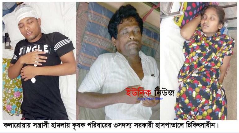 কলারোয়া(সাতক্ষীরা)প্রতিনিধি: সাতক্ষীরার কলারোয়ায় জমি জমা সংক্রান্তের জের ধরে এক কৃষক পরিবারে ৪সদস্যকে পিটিয়ে জখম করেছে সন্ত্রাসীরা। ঘটনাটি ঘটেছে-রোববার সকাল ৯টার দিকে উপজেলার কুশোডাঙ্গা ইউনিয়নের শাকদহ গ্রামে। জানা গেছে- উপজেলার শাকদহ গ্রামের নিরহ কৃষক আ: সবুর খানের জমি নিয়ে দীর্ঘ দিন ধরে প্রতিপক্ষ জিন্নাত খানের সহিত বিরোধ চলে আসছে। এরই জের ধরে রোববার সকাল ৯টার দিকে জিন্নাত খান, মহাসিন খান, ইমুন খান, পারুল খাতুনসহ ১০/১২ দলবেধে তাদের বাড়ীতে এসে গালি গালাজ শুরু করে। এতে প্রতিবাদ করাতে তারা ক্ষিপ্ত হয়ে আ: সবুর খান (৫০), তহমেনা খাতুন (২৩), রাব্বি খান (২০) ও সাঈদ খান (২৫) কে ধরে এলোপাতাড়ী ভাবে পিটিয়ে জখম করে ফেলে রেখে চলে যায়। পরে স্থানীয়দের সহযোগিতায় আহতরা কলারোয়া হাসপাতালে ভর্তি হয়। এঘটনায় কলারোয়া থানায় একটি অভিযোগ দায়ের হয়েছে।