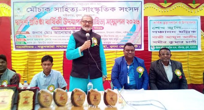 কপিলমুনি প্রতিনিধি : পাইকগাছায় মৌচাক সাহিত্য-সাংস্কৃতিক সংসদের দ্বাদশ প্রতিষ্ঠাবার্ষিকী উদযাপন ও সাহিত্য সম্মেলন শনিবার মরহুম মোস্তফা চেয়ারম্যান মিলনায়তনে সকালে অনুষ্ঠিত হয়েছে। কবি কফিল মাহামুদের সভাপতিত্বে প্রধান অতিথি ছিলেন উপজেলা চেয়ারম্যান আনোয়ার ইকবাল মন্টু। অনুষ্ঠানে প্রধান আলোচক ছিলেন নতুনতারা সমাজ কল্যাণ ও সাহিত্য সংস্থার প্রতিষ্ঠাতা মহাপরিচালক কবি সাইফুর রহমান মিনা। বিশেষ অতিথি ছিলেন উপজেলা ভাইস-চেয়ারম্যান শিহাব উদ্দিন ফিরোজ বুলু, আবদুল্লাহ আল মামুন, সাংবাদিক আলাউদ্দীন রাজা। সার্বিক ব্যবস্থাপনায় ও সঞ্চালনায় ছিলেন মৌচাক সাহিত্য-সাংস্কৃতিক সংসদের প্রতিষ্ঠাতা বিশিষ্ট কবি ও সাহিত্যিক পঞ্চানন মল্লিক। বক্তৃতা করেন মৌচাক সাহিত্য ও সাংস্কৃতিক সংসদের সাধারণ সম্পাদক কবি আ: আলীম, কবি কওসার আলী মোড়ল, কবি ফারিয়ার এফরান, কবি রুপা মন্ডল, শেখ জুলি, বেগম শামসুন্নাহার। অনুষ্ঠান শেষে মৌচাক সাহিত্য ও সাংস্কৃতিক সংসদের পক্ষ থেকে লেখকদের মাঝে প্রধান অতিথি উপজেলা চেয়ারম্যান আনোয়ার ইকবাল মন্টু সম্মাননা সনদ ও ক্রেস্ট প্রদান করেন।
