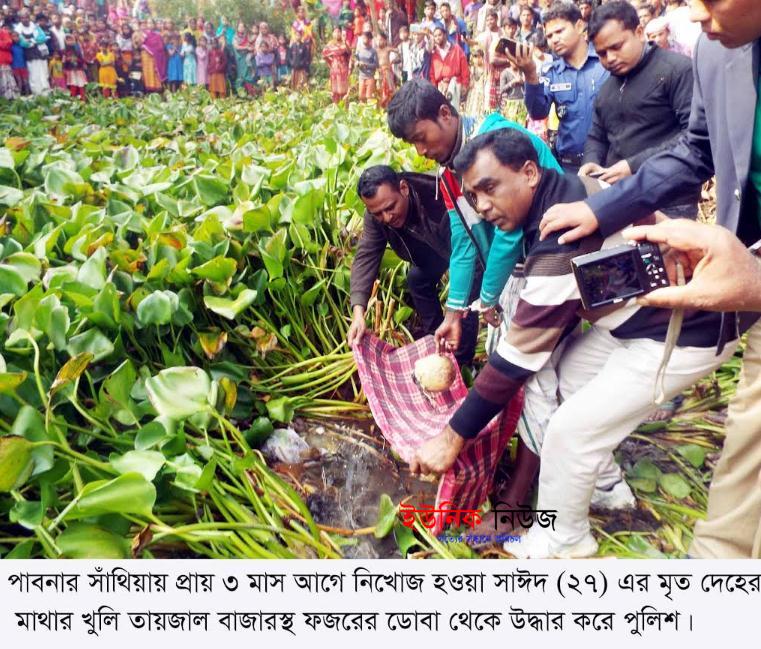 থানা পুলিশ সুত্রে জানা যায়, সাঁথিয়া উপজেলার আটিয়া পাড়া গ্রামের মন্তাজ আলীর ছেলে কাঠ মিস্ত্রী আবু স্ঈাদ গত ৩০ অক্টোবর/১৭ইং বাটালের ধার কাটাতে বাড়ি থেকে বের হয়। ছেলে বাড়িতে ফিরে না আসায় অনেক খোজাখুজির পর সাঈদের সন্ধান না পেয়ে গত ৪/১২/২০১৭ ইং তারিখে মন্তাজ আলী সাঁথিয়া থানায় একটি সাধারণ ডায়েরী করে। যার নং ১৪১ তাং ৪-১২-১৭ইং। থানায় দায়েরকৃত ডায়েরীর সুত্র ধরে এ এসপি সার্কেল বেড়া আশিস বিন হাসান এ ঘটনার রহস্য উদঘাটনে খোজ করতে থাকেন। তিনি সাঈদের মোবাইল ট্রাকিং করে সব তথ্য পেয়ে গত ২০/১/১৮ইং তারিখে রাজিবকে গ্রেফতার করে। এ ব্যাপারে মোন্তাজ আলী বাদী হয়ে সাঁথিয়া থানায় একটি হত্যা মামলা দায়ের করে। পুলিশ জানায়, গ্রেফতারকৃত রাজিবের স্বীকারোক্তিতে ফখরুল ও শামীমকে গ্রেফতার করা হয়েছে। ঘাতকদের ব্যাপক জিজ্ঞাসাবাদে মঙ্গলবার এ এসপি আশিস বিন হাসানের নেতৃত্বে তায়জাল বাজারের পাশে ডোবা থেকে সাঈদের মস্তক ও পার্শ্ববর্তী খয়েরবাগান এলাকায় রফিকের মেহগনি বাগান থেকে সাঈদের কংকাল মৃতদেহ উদ্ধার করে। এ সময় লাশ দেখার জন্য এলাকার শত শত নারী পুরুষ ভীড় জমায়।