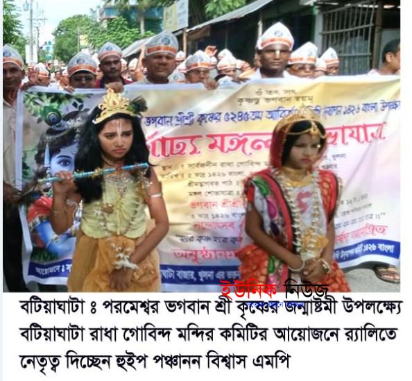 ইন্দ্রজিৎ টিকাদার, বটিয়াঘাটা : জাতীয় সংসদের হুইপ পঞ্চানন বিশ্বাস এমপি বলেছেন, বর্তমান সরকারের প্রধানমন্ত্রী জননেত্রী শেখ হাসিনার সরকার ক্ষমতায় আছে বলেই স্বাধীন স্বার্বভৌম রাষ্ট্রে প্রত্যেক মানুষ নিজ নিজ ধর্ম উৎসব মূখর পরিবেশে পালন করতে পারছে। ধর্ম নিয়ে কোথাও কোন হানাহানি নেই। এ এক অনন্য দৃষ্টান্ত। ধর্মীয় অনুশাসন মেনে চললে সমাজ থেকে সকল অপরাধ প্রবনতা দুর হয়। তিনি শুক্রবার বিকাল ৩ টায় বটিয়াঘাটা বাজার সার্ব্বজনীন রাধা গোবিন্দ মন্দির কমিটির আয়োজনে পরমেশ্বর ভগবান শ্রীকৃষ্ণের শুভ জন্মাষ্টমী উদযাপন উপলক্ষ্যে এক বর্নাঢ্য র্যালি ও আলোচনা সভায় প্রধান অতিথির বক্তৃতায় এ কথা বলেন। উদযাপন কমিটির সভাপতি সুখদেব সাহা সভাপতিত্বে অনুষ্ঠিত সভায় অন্যান্যের মধ্যে উপস্থিত ছিলেন জেলা আ’লীগের আইন বিষয়ক সম্পাদক এপিপি এড. নব কুমার চক্রবর্তী, ডাঃ তারিনী কান্ত মন্ডল, হিন্দু বৌদ্ধ খ্রীষ্টান ঐক্য পরিষদের সভাপতি অধ্যাপক মনোরঞ্জন মন্ডল, হুইপ তনয় সহকারি শিক্ষক পল্লব কুমার বিশ্বাস রিটু, উপজেলা প্রেসক্লাবের সভাপতি ও পূজা উদযাপন পরিষদের সহ-সভাপতি প্রতাপ ঘোষ, সাধারণ সম্পাদক ইন্দ্রজিৎ টিকাদার, অবঃ সহকারি পুলিশ সুপার নিখিল রঞ্জন মন্ডল, প্রধান শিক্ষক অনিল কুমার মন্ডল, প্রাথমিক শিক্ষক সমিতির সভাপতি সমীর মন্ডল, সাধারণ সম্পাদক ধীমান মন্ডল, সোনালী বিশ্বাস,এড. সুশিল গোলদার, সহকারি শিক্ষক সুমঙ্গল রায়, সহকারী শিক্ষক ত্রিবেনী মন্ডল, ব্যাংক কর্মকর্তা চিত্রা বিশ্বাস ও কার্তিক রায়, সমাজ সেবক পিয়াস মন্ডল, সাবেক ছাত্রনেতা শান্তনু মন্ডল ছুটুল, সাংবাদিক আহসান কবির, পরিতোষ রায়, শাওন হাওলাদার, সাবেক ইউপি সদস্য খোকন মল্লিক, পলাশ সরকার, অলোক মল্লিক, উজ্জ্বল দত্ত, যুবলীগ নেতা দেবু বালা, কুটি সাহা, অতুল সাহা, প্রমথেশ বিশ্বাস, ডাঃ সুমিত্রা বিশ্বাস, বিউটি বিশ্বাস, সুইটি বৈরাগী, প্রিংয়ঙ্কা মিস্ত্রী, অরিত্র ঘোষ,শ্রীজা ঘোষ, সূর্য মন্ডল, ধৈর্য মন্ডল প্রমূখ। অন্যদিকে বেলা ১১ টায় অনুরূপ এক র্যালি জগৎমাতা মন্দির কমিটির উদ্যোগে উপজেলা সদরের প্রধান প্রধান সড়ক সমূহ প্রদক্ষিণ করে। র্যালিতে উপস্থিত ছিলেন জাপার প্রেসিডিয়াম সদস্য সুনিল শুভ রায়, অবঃ অধ্যাঃ বিজয় কৃষ্ণ রায়, এড. প্রশান্ত বিশ্বাস প্রমূখ। অপরদিকে চক্রাখালী গৌড়িয় গৌর নিতাই সেবাশ্রম ও শাচিবুনিয়া মাতৃসংঘের উদ্যোগে বেলা ১২ টায় খুলনা চালনা সড়কের উপর দিয়ে অনুরূপ এক র্যালি বের করে । র্যালিতে উপজেলা চেয়ারম্যান মোঃ আশরাফুল আলম খান, বীরমুক্তিযোদ্ধা বিনয় সরকার, গোবিন্দ মল্লিক,রাজ কুমার রায়, বিধান হালদার, সুশিল মল্লিক, সুবির মল্লিক, প্রদীপ টিকাদার, অনুপ গোলদার, পার্থ রায় মিঠু প্রমূখ উপস্থিত ছিলেন। সকল অনুষ্ঠান