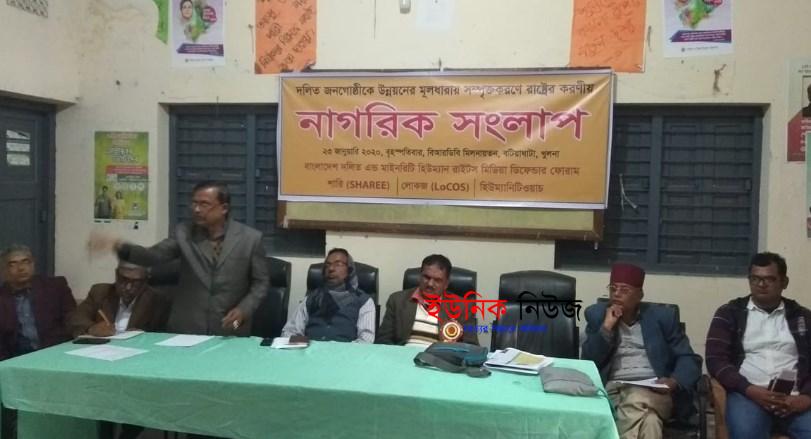 বিজ্ঞপ্তি : স্বেচ্ছাসেবী সংস্থা শারি, লোকজ, হিউম্যানিটিওয়াচ ও বাংলাদেশ দলিত এন্ড মাইনরিটি হিউম্যান রাইটস মিডিয়া ডিফেন্ডার ফোরামের যৌথ আয়োজনে দলিত জনগোষ্ঠীকে উন্নয়নের মূলধারায় সম্পৃক্তকরণে রাষ্ট্রের করণীয় শীর্ষক এক নাগরিক সংলাপ বটিয়াঘাটায় অনুষ্ঠিত। লোকজের নির্বাহী পরিচালক দেবপ্রসাদ সরকারের সভাপতিত্ত্বে আজ বৃহস্পতিবার উপজেলা বিআরডিবি মিলনায়তনে অনুষ্ঠিত সংলাপে অতিথি হিসাবে বক্তব্য রাখেন উপজেলা পরিষদের ভাইস চেয়ারম্যান নিতাই গাইন, মহিলা ভাইসচেয়ারম্যান চপলা মন্ডল বটিয়াঘাটা সদর ইউনিয়ন পরিষদ চেয়ারম্যান মনোরঞ্জন ম-ল, শারির প্রকল্প সমন্বয়কারী রঞ্জন বকসী নুপু, হিউম্যানিটিওয়াচের সাধারণ সম্পাদক শরিফুল ইসলাম সেলিম, মনোরঞ্জন ম-ল, মনোরঞ্জন অধিকারী, পঞ্চান্নন ম-ল, রবীন্দ্র নাথ ম-ল, প্রল্লাদ জোদ্দার, রিংটন ম-ল, দিপ্তী রায়, লোকমান হোসেন, তুষার দাশ, মিলন দাস এবং জয়দেব দাসসহ সংলাপে সমাজের বিভিন্ন শ্রেণি-পেশা এবং প্রান্তিক জনগোষ্ঠীর প্রতিনিধিরা দলিত সম্প্রদায়ের মানবেতর জীবনাবস্থা ও এই পিছিয়ে পড়া সম্প্রদায়ের উন্নয়নে রাষ্ট্রীয় করণীয় বিষয়ে আলোচনা করেন। সংলাপে বক্তারা দলিত জনগোষ্ঠীকে উন্নয়নের মূলধারায় সম্পৃক্তকরণের জন্য ভূমিহীন দলিত জনগোষ্ঠীর জন্য খাস জমির বন্দোবস্ত করা, পানীয় জলের সংকট মোকাবিলায় দলিতদের জন্য গভীর নলকুপ স্থাপনের উদ্যোগ গ্রহণ, স্বাস্থ্যসম্মত ল্যাট্রিনের ব্যবস্থা করা, সরকারি সেবা বা ভাতাসমূহে দলিতদের জন্য বিশেষ কোটা প্রদান, পিছিয়ে পড়া দলিত ছেলে মেয়েদের বিশেষ শিক্ষা বৃত্তি প্রদানসহ আগামী আদমশুমারীতে দলিতদের পেশাভিত্তিক স্বীকৃতি প্রদান করার আহ্বান জানান।