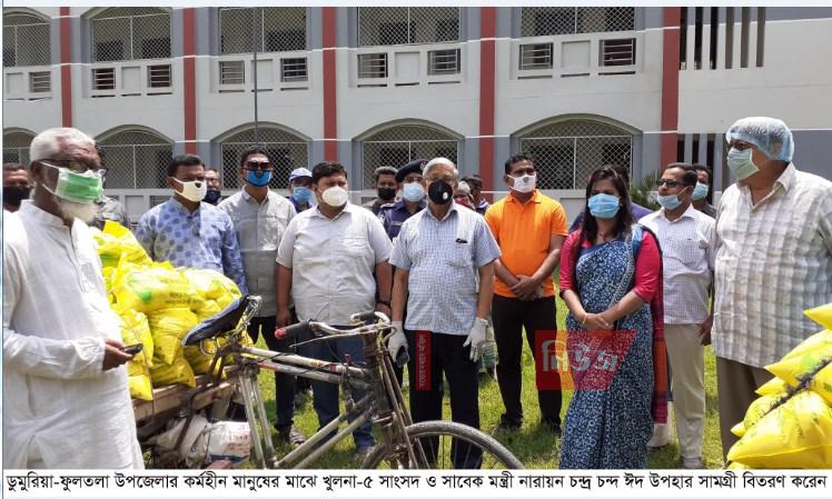 সুজিত মল্লিক, ডুমুরিয়া : করোনা ভাইরাসের প্রাদুর্ভাবের মধ্যে পবিত্র ঈদুল ফিতরকে সামনে রেখে খুলনা-৫ আসনের সাংসদ ও সাবেক মন্ত্রী নারায়ন চন্দ্র চন্দের পক্ষ থেকে তার নির্বাচনী এলাকা ডুমুরিয়া ও ফুলতলা উপজেলায় কর্মহীন হয়ে পড়া ২ হাজার মুসলিম পরিবারের মাঝে ঈদ উপহার বিতরণ করা হয়েছে। শুক্রবার সকালে ডুমুরিয়া শহীদ স্মৃতি মহিলা মহাবিদ্যালয় মাঠে দু’উপজেলার ১৮টি ইউনিয়নে দলীয় নেতৃবৃন্দের মাধ্যমে এ ঈদ সামগ্রী বিতরণ করা হয়। উপহার সামগ্রীর মধ্যে রয়েছে আড়াই কেজি চাল, ১ কেজি ডাল, ৫০০ গ্রাম চিনি ও ৫০০ গ্রাম সিমাই। এ সময় উপস্থিত ছিলেন ডুমুরিয়া উপজেলা পরিষদ চেয়ারম্যান গাজী এজাজ আহমেদ, উপজেলা নির্বাহী অফিসার মোছাঃ শাহনাজ বেগম, অফিসার ইনচার্জ আমিনুল ইসলাম বিপ্লব, উপজেলা প্রকল্প বাস্তবায়ন কর্মকর্তা আশরাফ হোসেন, আ’লীগ নেতা অধ্যক্ষ এবিএম শফিকুল ইসলাম, কলেজ অধ্যক্ষ শেখ শহিদুল ইসলাম, আ’লীগ নেতা শাহনেওয়াজ হোসেন জোয়াদ্দার, আবু সাঈদ সরদার, আলহাজ্ব শেখ হেফজুর রহমান, গাজী তৌহিদুল ইসলাম, কাজী নুরুল ইসলাম, আছফার হোসেন জোয়াদ্দার, সমীর দে গোরা, সঞ্জয় দেবনাথ, শেখ আছাদুজ্জামান, গাজী আব্দুস ছালাম, যুবলীগ নেতা প্রভাষক জিএম ফারুক হোসেন, প্রভাষক গোবিন্দ ঘোষ, ছাত্রলীগের আবুল বাশার প্রমুখ।