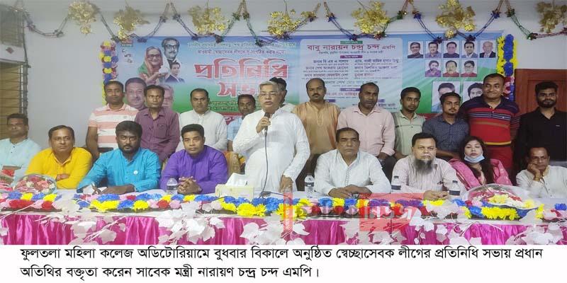 বুধবার বিকালে ফুলতলা সরকারি মহিলা কলেজ অডিটোরিয়ামে অনুষ্ঠিত স্বেচ্ছাসেবক লীগ ফুলতলা উপজেলা শাখার প্রতিনিধি সভায় প্রধান অতিথির বক্তৃতায় তিনি এ কথা বলেন। স্বেচ্ছাস্বেবক লীগ ফুলতলা উপজেলা আহবায়ক অজয় নন্দীর সভাপতিত্বে বিশেষ অতিথি ছিলেন খুলনা জেলা আওয়ামীলীগের সহসভাপতি বিএমএ সালাম, খুলনা জেলা স্বেচ্ছাসেবক লীগের সভাপতি শেখ মোঃ আবু হানিফ, জেলা আওয়ামীলীগের ধর্ম বিষয়ক সম্পাদক এ্যাড. তারিক হাসান মিন্টু, উপজেলা পরিষদের ভাইস চেয়ারম্যান ফারজানা ফেরদৌস নিশা, উপজেলা আওয়ামীলীগের ভারপ্রাপ্ত সাধারণ সম্পাদক মৃনাল হাজরা। প্রধান বক্তা ছিলেন খুলনা জেলা স্বেচ্ছাসেবক লীগের সাধারণ সম্পাদক এম এম আজিজুর রহমান রাসেল। স্বেচ্ছাস্বেবক লীগ ফুলতলা উপজেলা যুগ্ন আহবায়ক গাজী মোঃ ইদ্রিস আলীর পরিচালনায় অন্যান্যের মধ্যে বক্তৃতা করেন এস কে মিজানুর রহমান, এস রবীন বসু, ডুমুরিয়া যুবলীগের আহবায়ক গোবিন্দ্র কুমার ঘোষ, আশরাফুল আলম মোড়ল, উপজেলা ছাত্রলীগের সভাপতি মঈনুল ইসলাম নয়ন, মেহেদী আনাম রঞ্জু, ইকতিয়ার উদ্দিন সুমন, মুশফিক আহমেদ সুজা প্রমুখ।