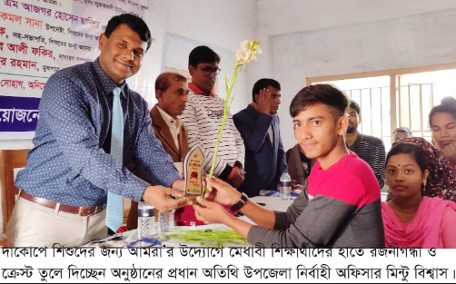দাকোপ প্রতিনিধিঃ দাকোপের নলিয়ানে সামাজিক সংগঠন শিশুদের জন্য আমরা’র উদ্যোগে কৃতি শিক্ষার্থীদের সংবর্ধনা ও শীতবস্ত্র (কম্বল) বিতরন করা হয়েছে। বৃহস্পতিবার সকাল ১০ টায় সুতারখালী ইউনিয়ন পরিষদ অডিটোরিয়ামে আয়োজিত অনুষ্ঠানে প্রধান অতিথি হিসাবে উপস্থিত ছিলেন দাকোপ উপজেলা নির্বাহী অফিসার মিন্টু বিশ্বাস। শিশুদের জন্য আমরা’র সহসভাপিত শেখ ফারুকের সভাপতিত্বে এবং সাধারণ সম্পাদক জব্বার ফকির ও সমন্বয়ক শামিনুর রহমানের যৌথ সঞ্চালনায় অনুষ্ঠানে বিশেষ অতিথির বক্তৃতা করেন দাকোপ উপজেলা প্রকল্প বাস্তবায়ন কর্মকর্তা শেখ আব্দুল কাদের, সুতারখালী ইউপি চেয়ারম্যান মাসুম আলী ফকির, সংগঠনের প্রধান উপদেষ্টা আজগর হোসেন ছাব্বির, উপদেষ্টা নীলকমল সানা। বক্তৃতা করেন ইউপি সদস্য আইয়ুব আলী ঢালী, জাহিদ ফকির, নিমাই রায়, বিভিন্ন বিদ্যালয়ের প্রধান শিক্ষক আদিত্য নারায়ন সরদার, জি এম শহিদুল ইসলাম, সুজিত কুমার রায়, কৃষ্ণপদ মন্ডল, অসিত কুমার মন্ডল, সুকুমার রায়, সংগঠনের সহসভাপতি আমিরুজ্জামান সোহাগ, কোষাধক্ষ্য অনিমেশ সরদার, শরিফুল ইসলাম, রিয়াদুল ইসলাম, গাজী রাজু, লাবনী খাতুন, আকিব আহমেদ বাপ্পী, লিয়ন বাওয়ালী, প্রসাদ মিস্ত্রি, সুজন মন্ডল, জাহিদ হোসেন রানা, শাকিল আহমেদ, তামান্না খাতুন, নদী আকতার, নাসিম খান। অনুষ্ঠানে সুতারখালী ইউনিয়ন থেকে ২০২২ সালে এস এসসি পরীক্ষায় জিপিএ ৫ প্রাপ্ত ৩৭ জন মেধাবী শিক্ষার্থীদের ফুল দিয়ে বরনসহ সম্মাননা ক্রেস্ট প্রদান, একই সাথে ৬ জন প্রধান শিক্ষককে সম্মাননা স্বারক উপহার দেওয়া হয়। কয়রা উপজেলার অসুস্থ মেধাবী শিক্ষার্থী বৃষ্টির শিক্ষা সহায়তা হিসাবে নগত ১০ হাজার টাকা প্রদান, শিশুদের মাঝে বিস্কুট বিতরন এবং গরীব অসহায়দের মাঝে শীতবস্ত্র কম্বল বিতরন করা হয়। অনুষ্ঠানের শুরুতে প্রধান অতিথিসহ আমন্ত্রিত অতিথিদের পুষ্পমাল্য ও ক্রেস্ট দিয়ে বরন করা হয়। অনুষ্ঠানে প্রধান অতিথি নির্বাহী অফিসার শিশুদের জন্য আমরা’র সামাজিক ও মানবিক কাজের প্রশংসা করে সংগঠনের তহবিলে ব্যক্তিগতভাবে ১০ হাজার টাকা অনুদান এবং সংগঠনের রেজিষ্টেশন কার্যালয় নির্মানসহ সকল কাজে সাধ্যমত সহায়তা করার ঘোষনা দেন। এরপর তিনি অন্যান্য অতিথিদের সাথে নিয়ে কালাবগী ৯ নং ওয়ার্ডে শিশুদের জন্য আমরা পরিচালিত আমাদের স্কুল পরিদর্শন করেন। তিনি স্কুলের ঘর সংস্কার এবং প্রয়োজনীয় সামগ্রী দেওয়ার প্রতিশ্রুতি দেন।