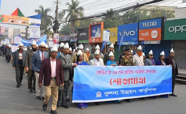 বিজ্ঞপ্তি : খুলনা উন্নয়ন কর্তৃপক্ষের ৬২তম প্রতিষ্ঠাবার্ষিকী উদযাপন উপলক্ষে বিভিন্ন কর্মসূচি পালন করা হয়। রোববার সকালে জাতীয় সংগীত বাজিয়ে জাতীয় পতাকা উত্তোলন করেন কর্তৃপক্ষের চেয়ারম্যান ব্রিগেডিয়ার জেনারেল এস এম মিরাজুল ইসলাম। বর্ণাঢ্য শোভাযাত্রা নগরীর তেতুঁলতলা মোড় হয়ে পুনরায় অফিসে এসে শেষ হয়। শোভাযাত্রায় কর্তৃপক্ষের সকল সদস্যসহ কর্মকর্তা/কর্মচারীগণ অংশগ্রহণ করেন।