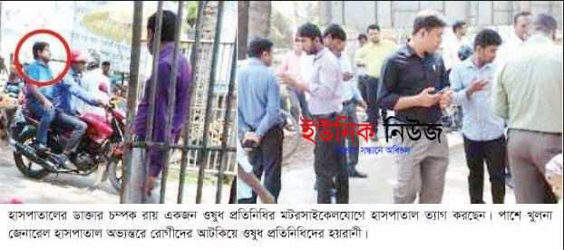 গত কয়েকদিনে খুলনা জেনারেল হাসপাতালে সরেজমিনে গেলে এ চিত্র ফুটে ওঠে। গত ২২ মার্চ সকালে ওই হাসপাতালের সহকারী রেজিস্ট্রার (মেডিসিন) ডাঃ চম্পক রায়কে এক ওষুধ প্রতিনিধির মোটরসাইকেলযোগে হাসপাতাল চত্বর ত্যাগ করতে দেখা যায়। ওই সময় হাসপাতালে ওই চিকিৎসকের খোঁজ নিতে গেলে কর্তব্যরত নার্সরা বলেন তিনি চেম্বারেই আছেন। কিন্তু তার চেম্বারে তাকে পাওয়া যায়নি। পরে জানা গেছে ইনসেপটা কোম্পানির প্রতিনিধি বশিরের সাথে ওই চিকিৎসক বাইরে গেছেন।