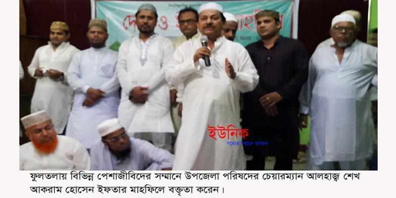 ফুলতলা অফিসঃ ফুলতলা উপজেলা পরিষদের চেয়ারম্যান আলহাজ্ব শেখ আকরাম হোসেন এর উদ্যোগে শুক্রবার বিকালে উপজেলা পরিষদ অডিটরিয়ামে অনুষ্ঠিত বিভিন্ন রাজনৈতিক নেতৃবৃন্দ, শিক্ষক,সাংবাদিক, জনপ্রতিনিধি ও বিশিষ্ট ব্যক্তিবর্গের সম্মানে আলোচনা সভা, দোয়া ও ইফতার মাহফিলের আয়োজন করা হয়। এ সময় অন্যান্যের মধ্যে উপস্থিত ছিলেন পরিষদের ভাইস চেয়ারম্যান কে এম জিয়া হাসান তুহিন, ওসি মনিরুল ইসলাম, উপজেলা আওয়ামীলীগের সাধারণ সম্পাদক সরদার শাহাবুদ্দিন জিপ্পী, শিক্ষাবিদ আনোয়ারুজ্জামান মোল্যা, শিল্পপতি ফেরদৌস আহমেদ ভুইয়া, ফিরোজ আহমেদ ভূইয়া, ইউপি চেয়ারম্যান শরীফ মোহাম্মদ ভুইয়া শিপলু, মাওঃ সাইফুল হাসান খান, আলহাজ্ব এনামুল হক ভুইয়া, আবু তাহের রিপন, মোশারফ হোসেন মোড়ল, সাবেক অধ্যক্ষ প্রফুল্ল কুম্রা চক্রবর্তী, সাংবাদিক শেখ মনিরুজ্জামান, শামসুল আলম খোকন, তাপস কুমার বিশ্বাস, মোঃ নেছার উদ্দিন, রবিউল ইসলাম মন্টু, হাজী আশরাফ, আলী আজম মোহন, ইসমাইল হোসেন বাবলু, মোল্যা হেদায়েত হোসেন লিটু, শাহাদাৎ বিশ্বাস, লাকি ভুইয়া, মনিরুল ইসলাম, আশরাফুল আলম কচি, এস কে সাদ্দাম হোসেন, মিজানুর রহমান, আঃ হাই সরদার, খুরশিদ মোড়ল, জনি মোল্যা প্রমুখ। পরে মুফতি আঃ জব্বার দোয়া ও মোনাজাত পরিচালনা করেন।
