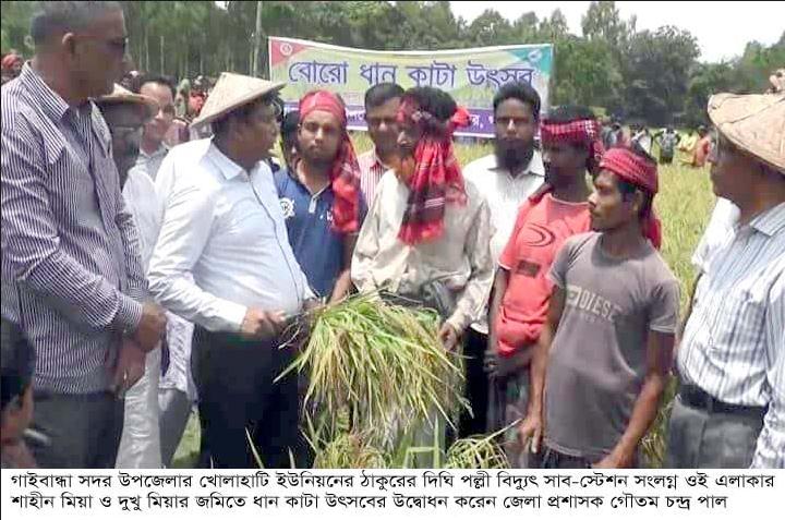 গাইবান্ধা প্রতিনিধিঃ গাইবান্ধা সদর উপজেলার খোলাহাটি ইউনিয়নের ঠাকুরের দিঘি পল্লী বিদ্যুৎ সাব স্টেশন সংলগ্ন জমিতে বুধবার বোরো ধান কাটা উৎসব অনুষ্ঠিত হয়। ওই এলাকার শাহীন মিয়া ও দুখু মিয়ার দু’বিঘা জমিতে ধান কাটা উৎসবের উদ্বোধন করেন জেলা প্রশাসক গৌতম চন্দ্র পাল।