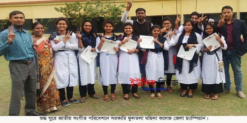 ফুলতলা (খুলনা) প্রতিনিধিঃ শুদ্ধ সুরে জাতীয় সংগীত পরিবেশন প্রতিযোগিতায় উচ্চ মাধ্যমিক পর্যায়ে খুলনা জেলায় ফুলতলার সরকারি মহিলা কলেজ চ্যাম্পিয়ান হওয়ার গৌরব অর্জন করে। রোববার সকাল ১০টায় সরকারি পাইনিয়ার মাধ্যমিক বালিকা বিদ্যালয়ে এ প্রতিযোগিতা অনুষ্ঠিত হয়। প্রতিযোগিতায় চ্যাম্পিয়ান প্রতিষ্ঠানের ইতি রানী, সাদিয়া ইয়াসমিন, মুনিয়া ইসলাম, দীপা সাহা, তাজিয়া খাতুন, শারমিন আক্তার, ফারজানা খাতুন, উর্মি মিত্র, সুমাইয়া আক্তার ও সুরাইয়া ইয়াসমিন অংশ নেয়। এদিকে সরকারি ফুলতলা মহিলা কলেজের এ কৃতিত্বে অভিনন্দন জানিয়েছেন সংসদ সদস্য নারায়ন চন্দ্র চন্দ, অধ্যক্ষ সমীর কুমার ব্রহ্ম, সহকারী অধ্যাপক উল্লাসিনী সরকার, প্রভাষক রেজোয়ান রাজা, গাজী মো: এনামুল হক সন্দীপ কুমার সকল শিক্ষক – কর্মচারি ও শিক্ষার্থীবৃন্দ।