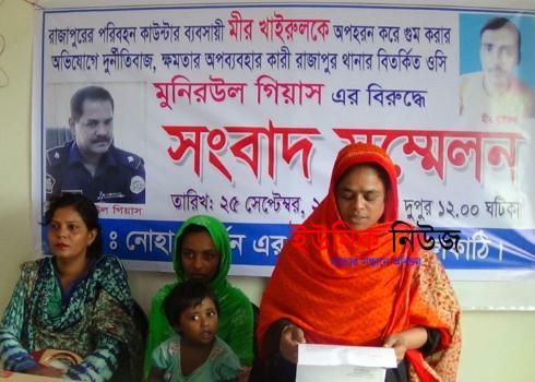 সংবাদ সম্মেলনে তিনি আরও বলেন, পূর্ব শত্রæতার জেরে তার স্বামীকে স্থানীয় একটি মাদক ব্যবসায়ী চক্র আপহরণ করে গুম করেছে বলে ধারণা করে প্রথমে তাদের বিরুদ্ধে থানায় মামলা করতে গেলে ওসি মুনীর উল গীয়াস মামলা না নিয়ে খারাপ ব্যবহার করে তাকে থানা থেকে তাড়িয়ে দেয়। এলাকার মাদক ব্যবসায়ীদের সাথে ওসির সখ্যতা এবং তাদের কাছ থেকে মাসোয়ারা নেয়ারও অভিযোগ করেন নারগিস বেগম। সংবাদ সম্মেলনে নিখোঁজ ব্যক্তির বাকপ্রতিবন্ধী মেয়ে মারিয়া (১৩) ও তাসিয়া (৩) উপস্থিত ছিলেন।