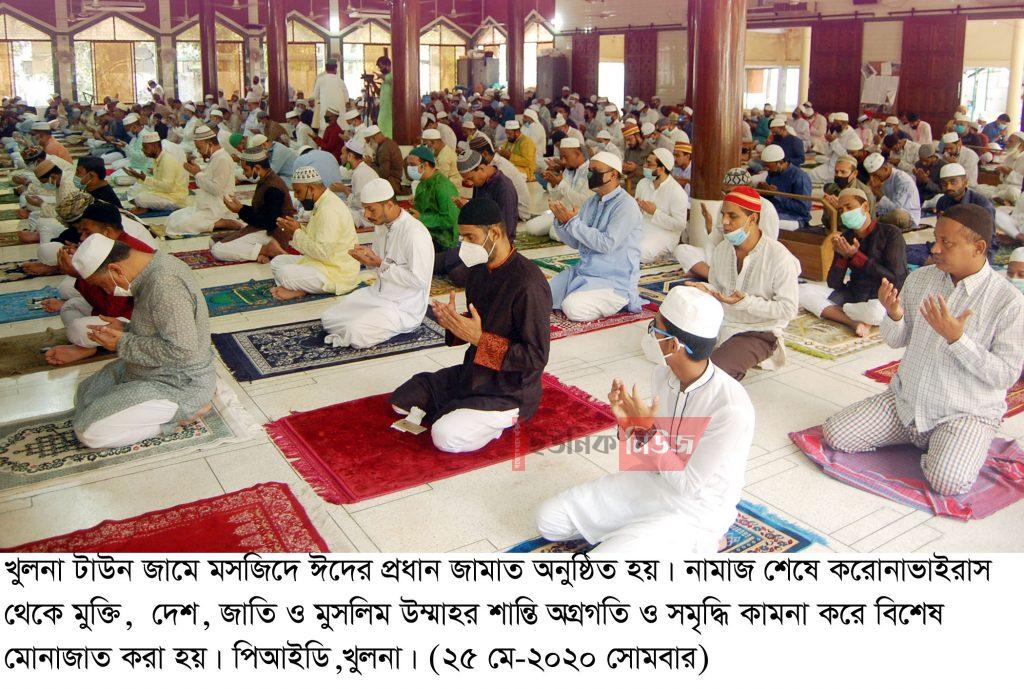 শারীরিক দূরত্ব বজায় রেখে সকাল আটটায় খুলনা টাউন জামে মসজিদে ঈদের প্রধান জামাত অনুষ্ঠিত হয়। জামাতে ইমামতি করেন টাউন জামে মসজিদের খতিব মাওলানা মোহাম্মদ সালেহ। এছাড়া কোর্ট জামে মসজিদে সকাল সাড়ে আটটায় একটি জামাত অনুষ্ঠিত হয়।