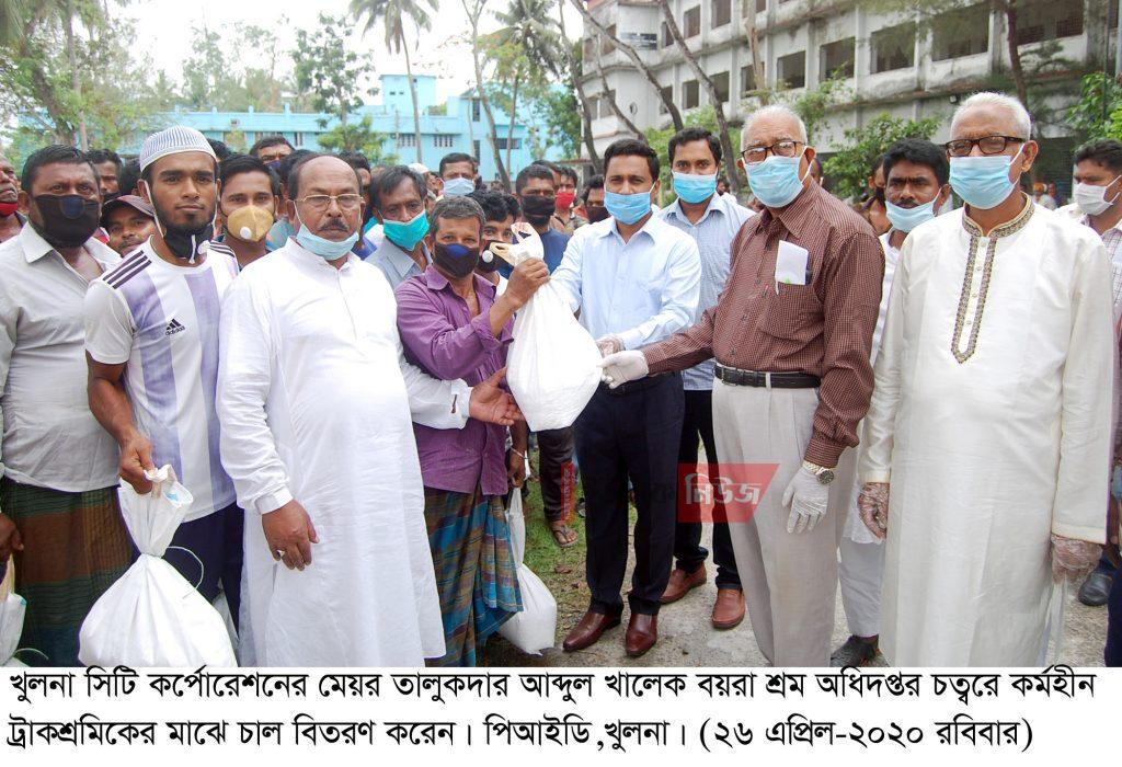 খুলনা অফিস : খুলনা সিটি কর্পোরেশনের মেয়র তালুকদার আব্দুল খালেক করোনাভাইরাস প্রতিরোধে প্রধানমন্ত্রী শেখ হাসিনা ঘোষিত ‘মানবিক সহায়তা কর্মসূচির’ আওতায় আজ (রবিবার) সকালে খুলনার বয়রা শ্রম অধিদপ্তর চত্বরে কর্মহীন প্রায় তিন হাজার ট্রাকশ্রমিকের মাঝে সাত কেজি করে চাল বিতরণ করেন।