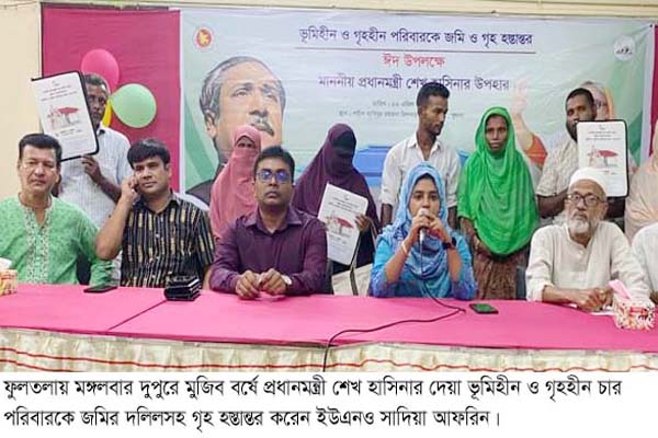 ফুলতলায় ঈদের ঠিক আগে জমিসহ বাড়ি পাওয়ায় ভ‚মিহীন ৪টি পরিবারের মুখে এখন রাজ্য জয়ের হাসি। মঙ্গলবার বেলা ১১টায় গণভবন থেকে প্রধানমন্ত্রী শেখ হাসিনা ভার্সুয়ালি উদ্বোধনের পর এসব পরিবারের হাতে ঘরের মালিকানাসহ দলিল তুলে দেওয়া হয়। ফুলতলা উপজেলা হাবিবুর রহমান মিলনায়তনে এ অনুষ্ঠানে সভাপতিত্ব করেন সহকারী কমিশনার (ভ‚মি) মোঃ আরিফুল ইসলাম। এতে প্রধান অতিথি হিসেবে উপস্থিত ছিলেন উপজেলা নির্বাহী অফিসার সাদিয়া আফরিন। উপজেলা মুক্তিযোদ্ধা সংসদের সাবেক কমান্ডার বীর মুক্তিযোদ্ধা কাজী জাফর উদ্দিন, বীর মুক্তিযোদ্ধা আশরাফ হোসেন আশু, উপজেলা প্রকৌশলী ইয়াছিন আরাফাত,প্রকল্প বাস্তবায়ন কর্মকর্তা মোঃ রফিকুল ইসলাম, আইসিটি কর্মকর্তা পুষ্পেন্দু দাস, সমাজসেবা কর্মকর্তা শাহীন আলম, বীজ কর্মকর্তা আনোয়ার হোসেন, নির্বাচন কর্মকর্তা শেখ জাহিদুর রহমান, প্রাথমকি শিক্ষা কর্মকর্তা মুহাঃ আবুল কাশেম,খাদ্য নিয়ন্ত্রন কর্মকর্তা মোঃ মিজানুর রহমান, অধ্যক্ষ সমীর কুমার ব্রক্ষ্ম, আওয়ীলীগ নেতা মোঃ আসলাম খান ইউপি চেয়ারম্যান শেখ মনিরুল ইসলাম, শেখ আবুল বাশার, শরীফ মোহাম্মাদ ভু্শইয়া শিপলু, , প্রেসক্লাব সভাপতি তাপস কুমার বিশ্বাস, সাংবাদিক শেখ মরিরুজ্জামান, সহকারী অধ্যাপক মোঃ নেছার উদ্দিন, উপজেলা প্রেসক্লাব সভাপতি শামসুল আলম খোকন প্রমুখ।