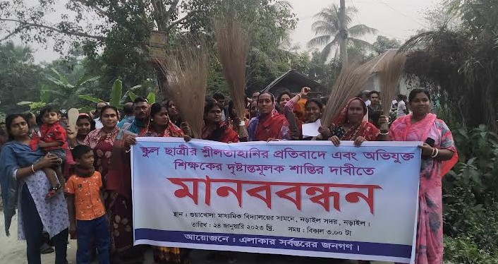 নড়াইল প্রতিনিধি : নড়াইল সদর উপজেলার শেখহাটি ইউনিয়নের গুয়াখোলা মাধ্যমিক বিদ্যালয়ের এক ছাত্রীকে ওই স্কুলের সহকারি শিক্ষক সুকান্ত গোস্বামী কর্তৃক শ্লীলতাহানি করার অভিযোগে মানববন্ধন ও ঝাড়ু মিছিল অনুষ্ঠিত হয়েছে। গত মঙ্গলবার বিকেলে গুয়াখোলা মাধ্যমিক বিদ্যালয়ের সামনে এলাকার নারী-পুরুষ ও অভিভাবকদের উদ্যোগে মানববন্ধন অনুষ্ঠিত হয়। মানববন্ধন চলাকালে বক্তৃতা করেন সহকারি অধ্যাপক রমেশ চন্দ্র অধিকারী, শেখহাটি ইউনিয়নের ৪নং ওয়ার্ড আওয়ামী লীগের সভাপতি অসীম কুমার পাল, সুধীর কুমার পাল, বিপ্রদা প্রসন্ন মল্লিক, স্মৃতি পাল, সুলভ অধিকারী প্রমুখ।