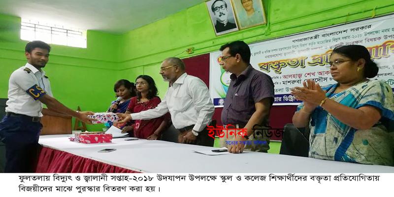 ফুলতলা (খুলনা) প্রতিনিধিঃ বিদ্যুৎ ও জ্বালানী সপ্তাহ-২০১৮ উদযাপন উপলক্ষে স্কুল ও কলেজ শিক্ষার্থীদের বক্তৃতা প্রতিযোগিতা ও পুরস্কার বিতরণী অনুষ্ঠান বুধবার বেলা ১১টায় উপজেলা অডিটরিয়ামে অনুষ্ঠিত হয়। ওজোপাডিকো ফুলতলা অফিস আয়োজনে ইউএনও মাশরুবা ফেরদৌসের সভাপতিত্বে অনুষ্ঠিত অনুষ্ঠানে প্রধান অতিথি ছিলেন উপজেলা পরিষদের চেয়ারম্যান আলহাজ্ব শেখ আকরাম হোসেন। স্বাগত বক্তৃতা করেন আবাসিক প্রকৌশলী খান আবুল হাসান। মহিলা বিষয়ক কর্মকর্তা ফারহানা ইয়াসমিনের পরিচালনায় অন্যান্যের মধ্যে উপস্থিত ছিলেন অধ্যক্ষ সমীর কুমার ব্রক্ষ্ম, প্রধান শিক্ষক সালমা খাতুন, সহকারী শিক্ষা অফিসার জান্নাতুল ফেরদৌস, উপ-সহকারী প্রকৌশলী মোঃ তোবারক আহম্মদ, মোঃ মামুন উর রশিদ, মোঃ জাকির হোসেন প্রমুখ। উপজেলার বিভিন্ন শিক্ষা প্রতিষ্ঠানের ১৫ শিক্ষার্থী প্রতিযোগি এ প্রতিযোগিতায় অংশ নেয়। পরে বিজয়ী ছাড়াও অংশ গ্রহণকারী সকল প্রতিযোগিকে পুরস্কৃত করা হয়।