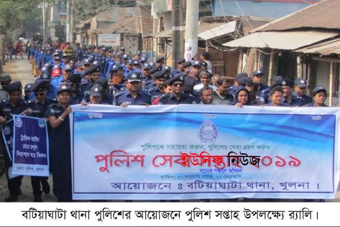 বটিয়াঘাটা প্রতিনিধি : পুলিশকে সহায়তা করুন,পুলিশের সেবা গ্রহণ করুন এই শ্লোগানকে সামনে রেখে বটিয়াঘাটা থানা পুলিশের আয়োজনে রবিবার বেলা ১১ টায় পুলিশ সেবা সপ্তাহ ২০১৯ উদযাপন উপলক্ষ্যে এক বর্নাঢ্য র্যালী অনুষ্ঠিত হয়। এ সময় অন্যান্যের মধ্যে উপস্থিত ছিলেন থানার ওসি মোঃ রবিউল কবীর, পুলিশ পরিদর্শক (তদন্ত) সরদার ইব্রাহীম হোসেন সোহেল, উপজেলা পুলিশং কমিটির সভাপতি ইউপি চেয়ারম্যান মনোরঞ্জন মন্ডল, উপজেলা প্রেসক্লাবের সভাপতি প্রতাপ ঘোষ,সাধারণ সম্পাদক ইন্দ্রজিৎ টিকাদার, আ’লীগ নেতা আকরাম হোসেন, রবীন্দ্রনাথ সরকার, নারায়ন চন্দ্র রায়, মোহাম্মদ আলী মীর, সাংবাদিক মোঃ মনিরুজ্জামান, সাংবাদিক শাহীন বিশ্বাস, সাংবাদিক মহিদুল ইসলাম শাহীন, সাংবাদিক শাওন হাওলাদার, এস আই যথাক্রমে, মোঃ সেকেন্দার, আহম্মেদ কবীর, আসাদুজ্জামান, সুপ্রভাত, প্রকাশ, বিশ্বনাথ, কামরুল, বিপ্লব, এ এস আই যথাক্রমে গণপতি সরকার, মোস্তফা, জাহিদ, নাজমুল, জিয়াউল, সোহাগ, মহিদুল ও থানার পুলিশ সদস্য সহ গ্রাম পুলিশ ও গন্যমান্য ব্যাক্তিবর্গ। র্যালিটি উপজেলা সদরের প্রধান প্রধান সড়ক সমূহ প্রদক্ষিণ শেষে থানা চত্বরে এসে এক আলোচনার মাধ্যমে শেষ হয়।