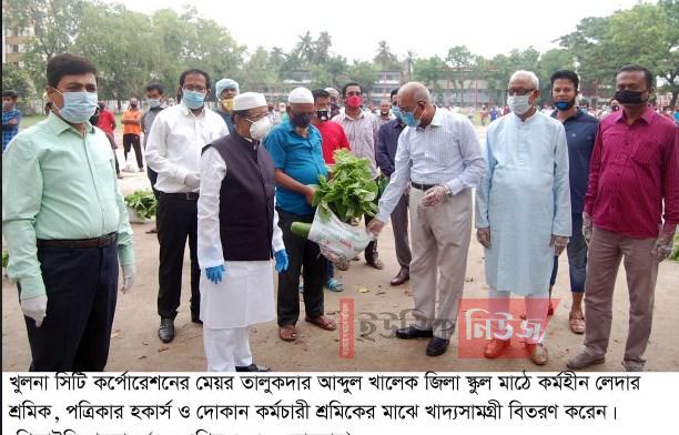 খুলনা অফিস : খুলনা সিটি কর্পোরেশনের মেয়র তালুকদার আব্দুল খালেক করোনাভাইরাস প্রতিরোধে জেলা প্রশাসনের উদ্যোগে ‘বেসরকারি মানবিক সহায়তা সেল’-এর আওতায় আজ (সোমবার) সকালে খুলনা জিলা স্কুল মাঠে তিনশত ২০ কর্মহীন লেদার শ্রমিক, পত্রিকার হকার্স ও দোকান কর্মচারী শ্রমিকের মাঝে সাত কেজি করে চাল, শাক, লাউ, করল্লা ও ঢেঁড়শসহ খাদ্যসামগ্রী বিতরণ করেন।