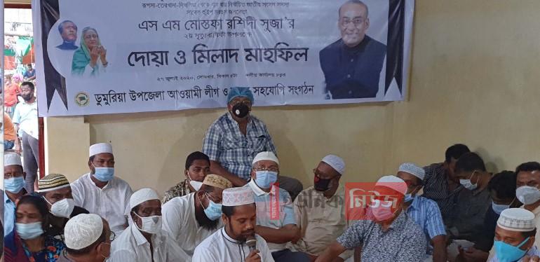 ডুমুরিয়া প্রতিনিধি : খুলনা জেলা আওয়ামী লীগের সাবেক সাধারণ সম্পাদক ও সাবেক হুইপ এস এম মোস্তফা রশিদী সুজা’র ২য় মৃত্যু বার্ষিকী উপলক্ষ্যে ডুমুরিয়া উপজেলা আওয়ামী লীগ ও সহযোগী সংগঠনের উদ্যোগে দোয়া ও মিলাদ মাহফিল অনুষ্ঠিত হয়েছে। সোমবার বিকেলে উপজেলা আওয়ামী লীগ কার্যালয়ে অনুষ্ঠিত মাহফিলে দোয়া ও মোনাজাত পরিচালনায় ছিলেন মাওলানা আব্দুর রাজ্জাক বিশ্বাস। এ সময় উপস্থিত ছিলেন জেলা আওয়ামী লীগ নেতা সাবেক অধ্যক্ষ এবিএম শফিকুল ইসলাম, উপজেলা আওয়ামী লীগের ভারপ্রাপ্ত সাধারণ সম্পাদক শাহনেওয়াজ হোসেন জোয়ার্দার, উপজেলা আওয়ামী লীগ নেতা ও রুদাঘরা ইউপি চেয়ারম্যান আলহাজ্ব মোস্তফা কামাল খোকন, উপজেলা আওয়ামী লীগ নেতা আবু সাঈদ সরদার, শেখ হেফজুর রহমান, শেখ নাজিবুর রহমান নাজু, গোপাল চন্দ্র দে, প্রভাষক জি এম ফারুক হোসেন, গাজী তৌহিদুজ্জামান, জেলা পরিষদ সদস্য শোভা রানী হালদার, হাসনা হেনা, মোল্যা সোহেল রানা, আছফর হোসেন জোয়ার্দার, মাসুদ রানা নান্টু, শেখ আছাদুজ্জামান, যুবলীগের প্রভাষক গোবিন্দ ঘোষ, শেখ ইকবাল হোসেন, বাবুল সরদার, রবিউল ইসলাম আন্টু, শিমু আক্তার, কাজী মেহেদী হাসান রাজা, জিল্লুর রহমান আকুঞ্জি, রাজিউল বারি সৈকত, শেখ আছাদুজ্জামান মিন্টু, সুমন সরদার, আমীর সোহেল, ছাত্রলীগের আবুল বাশার খান, শেখ মাসুদ রানা ও রবিউল ইসলাম প্রমুখ।