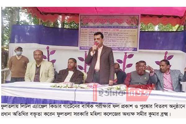 ফুলতলা (খুলনা) প্রতিনিধি// ফুলতলার লিটল এ্যঞ্জেল কিন্ডার গার্টেনের বার্ষিক পরীক্ষার ফলাফল ও পুরষ্কার বিতরণ করা হয়েছে। সোমবার বেলা ১১টায় বিদ্যালয়ের মাঠ চত্বরে এ ফল প্রকাশ করা হয়। বিশিষ্ট শিল্পপতি ও সমাজসেবক আলহাজ¦ ইমামুল হক ভুঁইয়ার সভাপতিত্বে পুরস্কার বিতরণী অনুষ্ঠানে প্রধান অতিথি ছিলেন ফুলতলা মহিলা ডিগ্রী কলেজের অধ্যক্ষ সমীর কুমার ব্র²। অনুষ্ঠানে স্বাগত বক্তৃতা করেন প্রতিষ্ঠানের প্রতিষ্ঠাতা পরিচালক প্রভাষক গৌতম কুন্ডু। বিশেষ অতিথি ছিলেন ইউপি চেয়ারম্যান শেখ আবুল বাশার ও মনিরুল ইসলাম সরদার, প্রভাষক জাহাঙ্গীর আলম, প্রেসক্লাব সভাপতি ও প্রধান শিক্ষক তাপস কুমার বিশ্বাস, ইউপি সদস্য জিএম ইমদাদুল হক মিটুল, সাবেক ইউপি সদস্য আলমগীর হোসেন মোল্যা। শিক্ষক মোঃ রাশেদ মোল্যার পরিচালনায় অন্যান্যের মধ্যে উপস্থিত ছিলেন কমিটির সদস্য জাহাঙ্গীর আলম, লাভলী রহমান, স্কুলের প্রধান শিক্ষক পরিমল কান্তি বিশ্বাস প্রমুখ। পরে কৃতি শিক্ষাথীদেরকে পুরস্কৃত করা হয়।