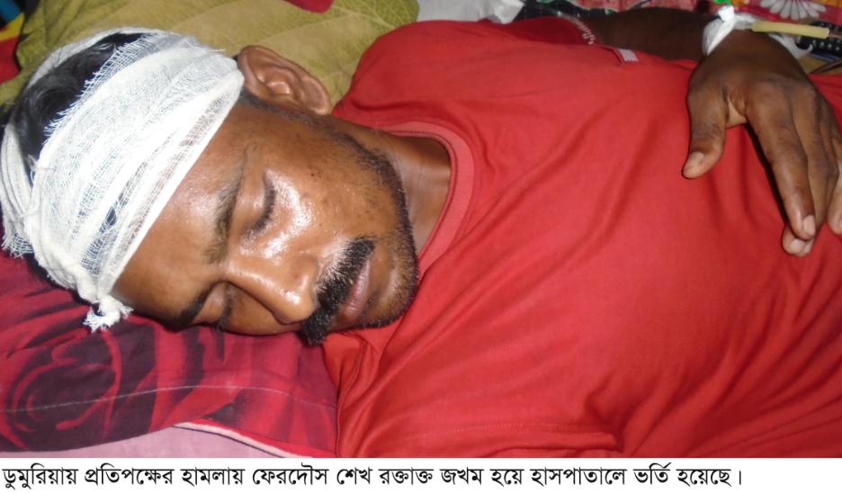 স্থানীয় ও হাসপাতাল সুত্রে জানা গেছে, উপজেলার শোভনা ইউনিয়নের মলমলিয়া গ্রামের ফেরদৌস শেখের (৩৭) সাথে প্রতিপক্ষ আদিল মোল্যার (৫০) জমিজমা সংক্রান্ত বিরোধ চলছিল। গতকাল শুক্রবার বিকেলে আদিল মোল্যা, তার দুই ছেলে আলামিন মোল্যা (৩৫) ও স্বাধীন মোল্যা (২০) জোর করে ফেরদৌসের জমির ওপর বিচেলীর ঘর নির্মাণ করতে যায়। এ সে বাধা দিতে গেলে প্রতিপক্ষরা ফেরদৌসকে লোহার রড ও কাঠের চলা দিয়ে বেধড়ক মারপিট করে। রডের আঘাতে তার মাথায় কেটে রক্তাক্ত জখম হয়। পরে স্থানীয়রা তাকে উদ্ধার করে ডুমুরিয়া হাসপাতালে ভর্তি করে। হাসপাতালের ডাঃ শাহিন জানান, রোগীর মাথায় প্রচন্ড আঘাত করায় ৭টি সেলাই দেওয়া হয়েছে। এছাড়া শরীরের বিভিন্ন স্থানে ফোলা জখম দেখা গেছে।
