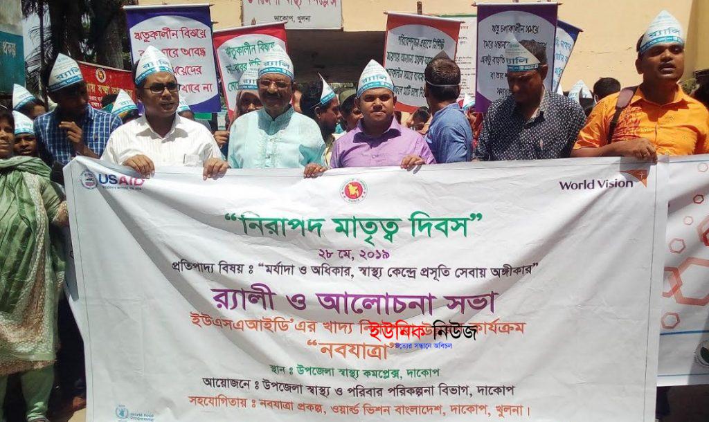 মঙ্গলবার সকাল ১০ টায় “মর্যাদা ও অধিকার স্বাস্থ্য কেন্দ্রে প্রসূতি সেবায় অঙ্গিকার” এই শ্লোগানে ব্যানার প্লাকার্ডসহ এ উপলক্ষে এক বর্ণাঢ্য র্যালী হাসপাতাল চত্বর থেকে বের হয়। র্যালীটি উপজেলা সদরের গুৃরুত্বপূর্ন সড়ক প্রদক্ষিন শেষে হাসপাতাল সেমিনার কক্ষে ফিরে এক আলোচনা সভার মাধ্যমে শেষ হয়। হাসপাতালের গাইনী জুনিয়র কনস্যালটেন্ট ডাঃ সন্তোষ কুমার মজুমদারের সভাপতিত্বে অনুষ্ঠানে প্রধান অতিথি হিসেবে উপস্থিত ছিলেন দাকোপ উপজেলা চেয়ারম্যান মুনসুর আলী খান। বিশেষ অতিথির বক্তৃতা করেন উপজেলা নির্বাহী অফিসার আব্দুল ওয়াদুদ। ইউএসএআইডির খাদ্য নিরাপত্তা উন্নয়ন কার্যক্রম নবযাত্রা, ওয়ার্ল্ডভিশন বাংলাদেশ, সুশীলন, রুপসা সংস্থা, এ্যাডরা বাংলাদেশ, সূর্যের হাসি এবং ফ্রেন্ডশীপ এনজিও’র অংশ গ্রহন সহযোগীতায় অনুষ্ঠিত সভায় অন্যন্যের মধ্যে আলোচনা করেন ডাঃ সাইফুদ্দিন আহম্মেদ, সংশ্লিষ্ট এনজিও প্রতিনিধি নাজমিন আরা, হিরন্ময় মন্ডল, হাসিবুল হোসেন টুটুল, চম্পা দাস, রীনা বিশ্বাস, কাজী ওয়াহিদুজ্জামান, আব্দুল খালেক, সুস্মিতা রায়, আজিজুর রহমান প্রমুখ।