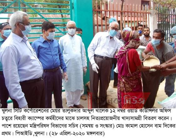 খুলনা সিটি মেয়র একই স্থানে করোনাভাইরাস প্রতিরোধে জেলা প্রশাসনের উদ্যোগে ‘বেসরকারি মানবিক সহায়তা সেল’-এর আওতায় বিহারী ক্যাম্পের প্রায় এক হাজার কর্মহীন মানুষের মাঝে শাক, লাউ, করল্লা ও ঢেঁড়শসহ খাদ্যসামগ্রী বিতরণ করেন।
