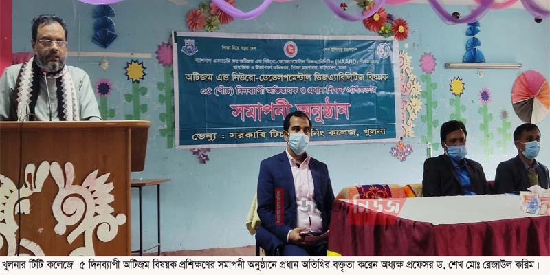 ফুলতলা (খুলনা) প্রতিনিধি// অটিজম এন্ড নিউরো-ডেভেলপমেন্টাল ডিজএ্যাবিলিটিজ বিষয়ক ৫ দিনব্যাপী প্রধান শিক্ষক ও অভিভাবকদের প্রশিক্ষণের সমাপনী অনুষ্ঠান অনুষ্ঠিত হয়েছে। শুক্রবার বিকালে খুলনার সরকারি টিচার্স ট্রেনিং কলেজ মিলনায়তনে এই প্রশিক্ষণের সমাপনী অনুষ্ঠান অনুষ্ঠিত হয়। এতে সভাপতিত্ব করেন সহকারী অধ্যাপক মোঃ সাহেদুল আলম। সমাপনী অনুষ্ঠানে প্রধান অতিথি ছিলেন টিচার্স ট্রেনিং কলেজের অধ্যক্ষ প্রফেসর ড. শেখ মোঃ রেজাউল করিম। বিশেষ অতিথি ছিলেন খুলনা জেলা শিক্ষা অফিসার খন্দকার রুহুল আমিন। এ সময় বক্তৃতা করেন প্রধান শিক্ষক তাপস কুমার বিশ্বাস, প্রধান শিক্ষক আইউব হোসেন, সহকারী প্রধান শিক্ষক জুলফিকার আলী, মোঃ আশরাফুল ইসলাম । অনুষ্ঠান পরিচালনা করেন প্রভাষক মোঃ সাজ্জাদ হোসেন খান।