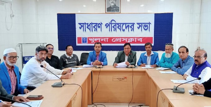বিজ্ঞপ্তি : খুলনা প্রেসক্লাবের সাধারণ পরিষদের প্রথম সভা শুক্রবার সকালে ক্লাবের হুমায়ূন কবীর বালু মিলনায়তনে অনুষ্ঠিত হয়। সভায় সভাপতিত্ব করেন ক্লাবের সভাপতি এস এম নজরুল ইসলাম। সভা পরিচালনা করেন ক্লাবের সাধারণ সম্পাদক মামুন রেজা। সভায় কোষাধ্যক্ষ এস এম কামাল হোসেন ক্লাবের ২০২৩ সালের বাজেট পেশ করেন এবং তা সর্বসম্মতিক্রমে অনুমোদন দেয়া হয়। এছাড়া সভায় ক্লাবের উন্নয়নসহ বেশ কয়েকটি গুরুত্বপূর্ণ বিষয়ে সিদ্ধান্ত নেয়া হয়।