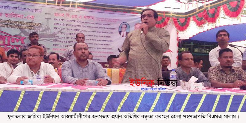 ফুলতলা (খুলনা) প্রতিনিধিঃ জামিরা ইউনিয়ন আওয়ামীলীগের উদ্যোগে এক জনসভা শনিবার বিকালে জামিরা মাদ্রাসা চত্বরে মোল্যা শাহাবাজের সভাপতিত্বে অনুষ্ঠিত হয়। সভায় প্রধান অতিথি ছিলেন জেলা আওয়ামীলীগের সহসভাপতি বিএমএ সালাম। বিশেষ অতিথি ছিলেন জেলা নেতা মোঃ আসলাম খান, আওয়ামীগ নেতা কাজী আশরাফ হোসেন আশু, শেখ রওশন আলী মৃনাল হাজরা, আবু তাহের রিপন, । আঃ হকের পরিচালনায় অন্যান্যের মধ্যে বক্তৃতা করেন সরদার আলাউদ্দিন, শওকত আলী আকুঞ্জী, মিজানুর রহমান সরদার এসকে আলী ইয়াছিন, শহিদুল্লাহ প্রিন্স, রবিন বসু, মোল্যা রবিউল ইসলাম, আশরাফুল আলম মোড়ল, মঈনুল ইসলাম নয়ন, প্রেমচাঁদ দাস, শফিকুল ইসলাম মোল্যা, শফিকুল ইসলাম, গাজী আঃ হামিদ, গহর আলী বিশ্বাস, গোলাম মোস্তফা, আলী আকবর, আশোক হালদার প্রমুখ।