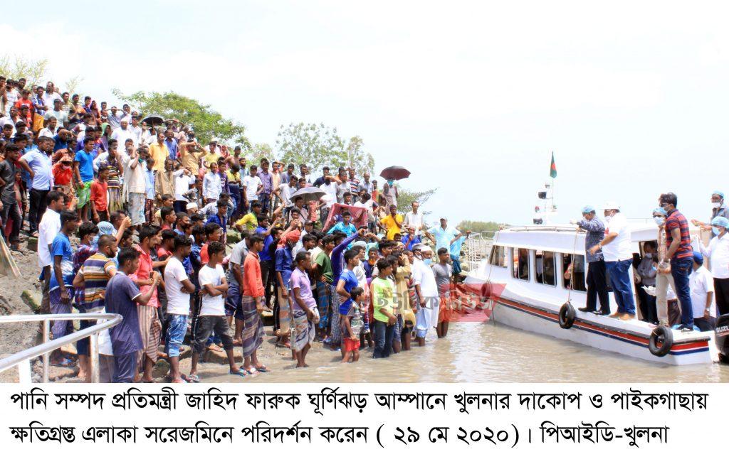 খুলনা অফিস : পানি সম্পদ প্রতিমন্ত্রী জাহিদ ফারুক আজ (শুক্রবার) সারাদিন ঘূর্ণিঝড় আম্পানে খুলনার উপকূলীয় উপজেলা দাকোপ ও পাইকগাছায় ক্ষতিগ্রস্ত এলাকা সরেজমিনে পরিদর্শন করেন।