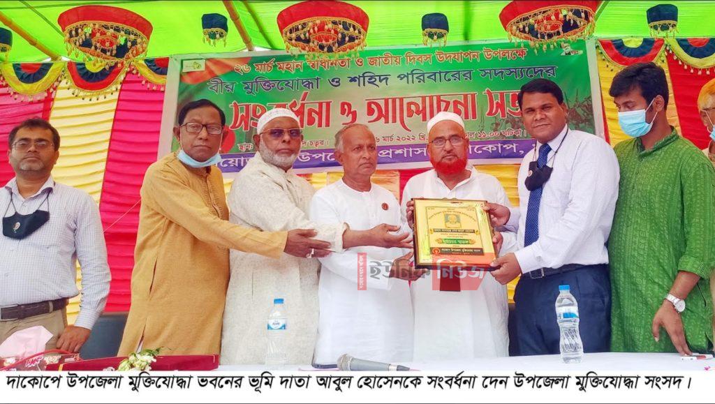 দাকোপ প্রতিনিধিঃ দাকোপের উপজেলা পরিষদের সাবেক চেয়ারম্যান ও উপজেলা আওয়ামী লীগের সভাপতি আলহাজ¦ শেখ আবুল হোসেনকে বীর মুক্তিযোদ্ধারা সংবর্ধনা প্রধান করেছেন। ২৬ মার্চ উপজেলা পরিষদ মাঠ প্রাঙ্গনে তাকে এ সংবর্ধনা প্রদান করা হয়েছে। উপজেলা নির্বাহী অফিসার মিন্টু বিশ^াসের সভাপতিত্বে এবং সমাজসেবা কর্মকর্তা প্রবীর রায়ের পরিচালনায় অনুষ্ঠিত সংবর্ধনা সভায় সন্মানিত অতিথি হিসেবে উপস্থিত ছিলেন সংবর্ধিত অতিথি উপজেলা আওয়ামী লীগের সভাপতি ও উপজেলা পরিষদ সাবেক চেয়ারম্যান আলহাজ¦ শেখ আবুল হোসেন। এ সময় বিশেষ অতিথির বক্তৃতা করেন উপজেলা সহকারী কমিশনার (ভূমি) গালিব মাহমুদ পাশা, থানা অফিসার ইনচার্জ আননুর যায়েদ, উপজেলা আওয়ামী লীগের সাধারণ সম্পাদক ও ইউপি চেয়ারম্যান বিনয় কৃষ্ণ রায়, চালনা পৌরসভার মেয়র সনত কুমার বিশ^াস, উপজেলা পরিষদ ভাইস চেয়ারম্যান গৌরপদ বাছাড়, উপজেলা স্বাস্থ্য ও পরিবার পরিকল্পনা কর্মকর্তা ডাঃ মোজাম্মেল হক নিজামী, বীর মুক্তিযোদ্ধা এম এ আমজাদ হোসেন,বীর মুক্তিযোদ্ধা মোহিত চন্দ্র রায়, বীর মুক্তিযোদ্ধা আবজাল হোসেন, বীর মুক্তিযোদ্ধা আব্দুল ওয়াহেদ গাজী,ইউপি চেয়ারম্যান পঞ্চানন মন্ডল, বীর মুক্তিযোদ্ধার সন্তান পল্লাব বিশ^াস, সাংবাদিক মোঃ মামুনুর রশিদসহ উপজেলার বিভিন্ন দপ্তর প্রধান ও জনপ্রতিনিধিবৃন্দ।