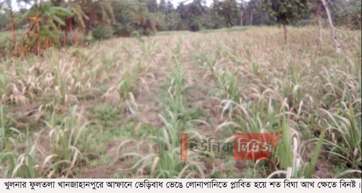 কৃষি অফিস সূত্র জানায়, গত ২০ মে রাতে ঘুর্ণিঝড় আম্ফানে ভৈরব নদীর জোয়ারের লোনাপানির তোড়ে খানজাহানপুর গ্রামের কার্লভার্ট সংলগ্ন ভেড়িবাধ ভেঙে আখ ক্ষেত প্লাবিত করে। পরিস্থিতি স্বাভাবিক হলে ২/৩ দিন পর লোনাপানি নেমে যায়। তবে লবনাক্ততার প্রভাবে শতাধিক কৃষকের মওসুমী ফসল ক্ষেতের আখ ধীরে ধীরে বাদামী বর্ণ ধারণ করে শুকিয়ে মারা যায়। এতে ক্ষতির পরিমান কোটি টাকা বলে কৃষি সম্প্রসারণ অধিদপ্তরের সংশ্লিষ্ট উপ-সহকারী কৃষি কর্মকর্তা চামেলী মল্লিকের দাবি। খানজাহানপুর গ্রামের আখ চাষী ইসলাম শেখ (৩৫) বলেন, ভৈরব পাড়ের নিজস্ব ৫০ শতাংশ জমিতে ব্যাংক ঋণ করে আখের আবাদ করেছি। এ পর্যন্ত ৬০ হাজার টাকা খরচ হয়েছে। এ ফসল উঠতে আরও ৫০/৬০ হাজার টাকা খরচ হবে। অন্যান্য বছরের গড় হিসাব অনুযায়ী ২ লক্ষাধিক টাকা বিক্রি হওয়ার কথা। কিন্তু লোনাপানি উঠে সম্পূর্ন আখই মরে গেছে। এখন চিন্তা একদিকে সারা বছরের ভরণ পোষন, অনদিকে ঋণ পরিশোধের। পার্শ্ববর্তী পায়গ্রাম কসবা গ্রামের বর্গাচাষী শেখ কামাল (৫০) বলেন, একটি এনজিও থেকে ৫০ হাজার টাকা ঋণ ও অন্যের দেড় বিঘা জমি বর্গা নিয়ে আখ চাষে নামি। আশ্বিন/ কার্ত্তিক মাসে ফসল বিক্রি করে টাকা পরিশোধ করা হবে এমন ওয়াদা করে ফুলতলা বাজারের একটি দোকান থেকে সার ও কীটনাশক বাকিতে এনেছি। কিন্তু ঘুর্ণিঝড়ের সময় ভেড়িবাধ ভেঙে নদীর লোনা পানি উঠে ক্ষেতের সব আখ মরে যায়। এ অবস্থায় এনজিও ঋণ, বাকিতে আনা সার ও কীটনাশকের টাকা পরিশোধের চিন্তায় নাওয়া-খাওয়া বন্ধ। চরের জমিতে বছরে একবার আখ চাষ করতে বিঘা প্রতি প্রায় এক লক্ষ টাকা খরচ করলে সাধারণত দেড় থেকে ২ লক্ষ টাকা বিক্রি হয়। এ কথা বলেন খানজাহানপুর গ্রামের প্রবীন আখ চাষী ওয়েজক্রণ শেখ (৬৫)। তিনি নিজস্ব আড়াই বিঘা জমিতে লক্ষাধিক টাকা ইতোমধ্যে খরচ করেছেন। আর ৩ মাস পর ফসল উঠলে সে টাকা দিয়ে সারা বছরের সংসারের ভরণ পোষনের ব্যায় নির্বাহ করা হয়। কিন্ত আকষ্মিক লোনাপানির প্লাবনে সবই শেষ।