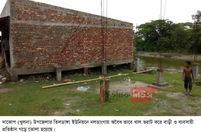 আজগর হোসেন ছাব্বিরঃ দাকোপের তিলডাঙ্গা ইউনিয়নে নলডাংগায় অবৈধ ভাবে খাল ভরাট করে বাড়ী ও ব্যবসায়ী প্রতিষ্ঠান গড়ে তোলার অভিযোগ পাওয়া গেছে। যে কারনে প্রায় প্রায় ৪ হাজার বিঘা জমির পানি প্রবাহ বন্ধ হওয়ায় জলাবদ্ধতা সৃষ্টি হয়ে ফসল উৎপাদন ব্যহত হচ্ছে। ভুক্তভোগীরা প্রতিকার চেয়ে উপজেলা নির্বাহী অফিসার বরাবর লিখিত অভিযোগ দিয়েছে।