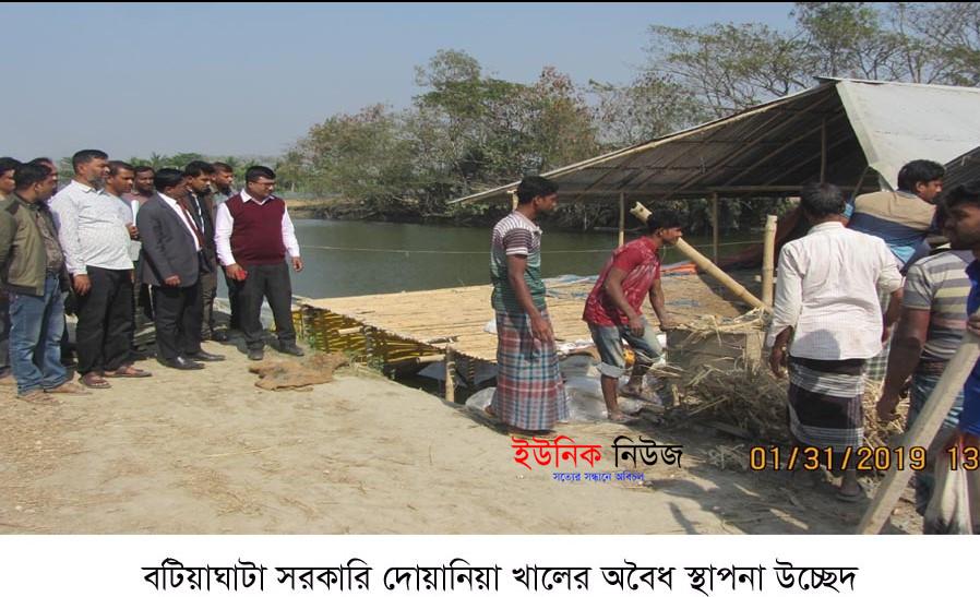 বটিয়াঘাটা প্রতিনিধি : বটিয়াঘাটায় বৃহস্পতিবার বেলা ১১ টায় উপজেলা নির্বাহী কর্মকর্তা দেবাশীষ চৌধূরী ও সহকারী কমিশনার (ভূমি), মোঃ দেলোয়ার হোসেন এর নেতৃত্বে উপজেলা গঙ্গারামপুর ইউনিয়নের দোয়ানিয়া খালের অবৈধ দখল দারিত্বের বিরুদ্ধে অভিযান পরিচালনা করেন। অভিযান কালে পারশলুয়া গ্রামের মৃতঃ সৈয়দ হাওলাদারের পুত্র মোঃ জয়নাল হাওলাদার, বিত্তিশলুয়া গ্রামের আনসার হাওলাদারের পুত্র ফারুক হাওলাদার, হেতালবুনিয়া গ্রামের সত্তার হাওলাদারের পুত্র জামাল হাওলাদার, তিতুখালী গ্রামের ধীরেন্দ্রনাথ বিশ্বাসের পুত্র সুশান্ত বিশ্বাস ও প্রশান্ত বিশ্বাস এবং শুভংকর মন্ডল কে উক্ত খাল থেকে উচ্ছেদ করে অবৈধ স্থাপনা ভেঙ্গেদেন। এ সময় উপস্থিত ছিলেন গঙ্গারামপুর ইউনিয়ন পরিষদের চেয়ারম্যান শেখ হাদী উজ-জামান হাদী, সহ ইউপি সদস্য, সাংবাদিক ও গন্যমান্য ব্যাক্তিবর্গ। এ ব্যাপারে খাল দখলকারী জামাল হাওলাদারকে জিজ্ঞাসা করলে এ প্রতিবেদককে জানান আমরা জমিদারি স্টেট থেকে ক্রয় সূত্রে দলিল মোতাবেক খালে পল্টি ও মাছ চাষ করে আসছি। তবে সহকারী কমিশনার (ভূমি), মোঃ দেলোয়ার হোসেন বলেন খালটি রাষ্ট্রীয়ত্ব সরকারী খাল এটা ব্যাক্তিমালিকানায় যাওয়ার কোন সুযোগ নাই।
