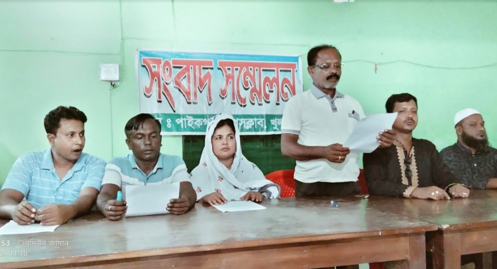 এফ, এম বদিউর জামানঃ পাইকগাছা গদাইপুর ইউপি চেয়ারম্যান, সদস্য চৌকিদার সহ ৯ জনের নামে মিথ্যা মামলা প্রত্যাহার ও নিন্দা জানিয়ে শুক্রবার সকালে পাইকগাছা প্রেসক্লাবে সাংবাদিক সম্মেলন অনুষ্ঠিত হয়েছে। গদাইপুর ইউপি সদস্যদের পক্ষে প্যানেল চেয়ারম্যান খোরশেদুজ্জামান লিখিত বক্তব্যে বলেন, হিতামপুর গ্রামের বিনোদ দাসের পুত্র অসিত দাশ এলাকায় ছাগল চোর ও একজন প্রতারক হিসাবে সকলের নিকট পরিচিত। সে প্রতারনার মাধ্যমে ইতিপূর্বে বহু লোকের নিকট থেকে টাকা হাতিয়ে নিয়েছে। তারই ধারা বাহিকতায় উক্ত অসিত দাশ একই গ্রামের মৃত অধির বিশ্বাসের পুত্র প্রভাষ বিশ্বাসের নিকট থেকে বিভিন্ন সময় ১,৭২, ০০০/ টাকা হাতিয়ে নেয় এবং জোর পূর্বক ফাকা চেক ও স্ট্যাম্পে স্বাক্ষর করে নেয়। এ ঘটনায় প্রভাষ বাদী হয়ে অসিত দাশের নামে জি আর ৩২৯/২০ নং মামলা দায়ের করে। যাহা চলমান রয়েছে। এ দিকে প্রভাষ বিশ্বাস তার পাওনা টাকা আদায় ও চেক স্ট্যাম্প উদ্ধারের জন্য গদাইপুর ইউপি চেয়ারম্যান বরাবর আবেদন করে। ইউপি চেয়ারম্যান গত ১৯ জুলাই উভয় পক্ষকে পরিষদে হাজির হওয়ার জন্য নোটিশ করে। নির্ধারিত সময়ে হাজির হয়ে অসিত দাশ এই ঘটনায় আদালতে মামলা চলছে জানালে চেয়ারম্যান শালিস স্থগিত করে। কিন্তু গত ২৬ জুলাই অসিত বাদী হয়ে চেয়ারম্যান, ইউপি সদস্য ও চৌকিদার সহ ৯ জনের নামে চাঁদাবাজি, মারপিট সহ বিভিন্ন অভিযোগ তুলে পাইকগাছা সিনিয়র জুডিশিয়াল ম্যাজিস্ট্রেট আদালতে মামলা দায়ের করে। উক্ত মামলা অবিলম্বে প্রত্যাহারের দাবীতে গদাইপুর ইউপি সদস্যরা সাংবাদিক সম্মেলন করেছে। পাশাপাশি উক্ত মামলা দায়ের করায় নিন্দা জানিয়েছেন।