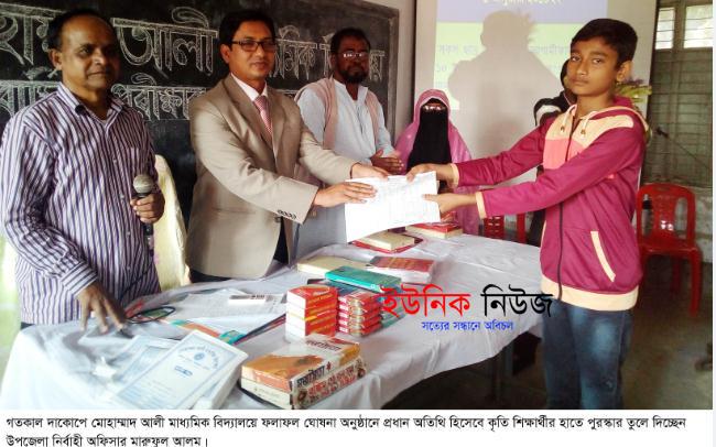 রবিবার বেলা ১২ টায় উপজেলা সদর চালনা মোহাম্মাদ আলী মাধ্যমিক বিদ্যালয়ে প্রধান অতিথি হিসেবে বার্ষিক ফলাফল ঘোষনা ও কৃতি শিক্ষার্থীদের মাঝে পুরস্কার বিতরন করেন দাকোপ উপজেলা নির্বাহী অফিসার মারুফুল আলম। বিদ্যালয়ের প্রধান শিক্ষক প্রশান্ত কুমার বৈদ্যের সভাপতিত্বে অনুষ্ঠানে বিশেষ অতিথির বক্তৃতা করেন চালনা পৌরসভার প্যানেল মেয়র আব্দুল গফুর সানা, ৯ নং ওয়ার্ড কাউন্সিলর রবীন্দ্রনাথ সরদার। বক্তৃতা করেন বিদ্যালয়ের প্রতিষ্ঠাতার পতিœ আলহাজ্ব মমতাজ বেগম, পরিচালনা কমিটির সদস্য গোলাম কাদের, কৃষ্ণপদ রায়, শিক্ষক হাশেম আলী শেখ, শিক্ষার্থী নুসরাত জাহান, ফাগুন রায়। অনুষ্ঠানটি পরিচালনা করেন শিক্ষক আনিসুর রহমান।